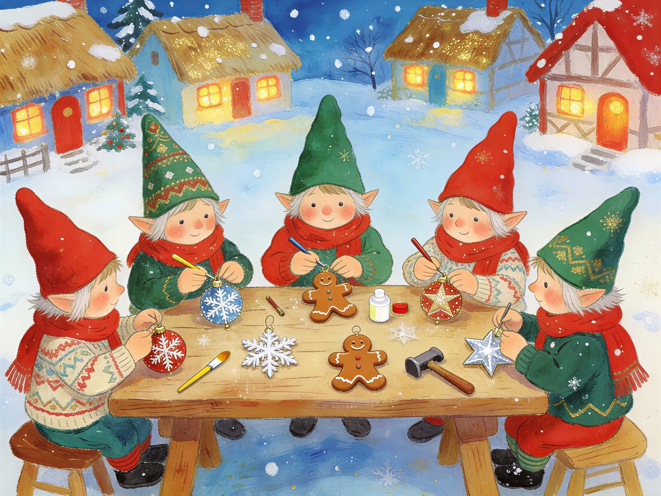 Prompt: A digital painting depicts Santa Claus and a young pretty blond woman meticulously decorating gingerbread cookies, cakes, and other desserts on an antique wooden table laden with Christmas sweets in a cozy, festive kitchen during snowfall outside a large window. Santa Claus, with a long white beard and mustache, wears a red and green velvet suit
