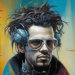 Surreal artwork of a humanoid figure with a blue, dotted animal-like head and a patterned coat, set against a muted green background.humanoid