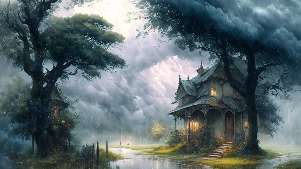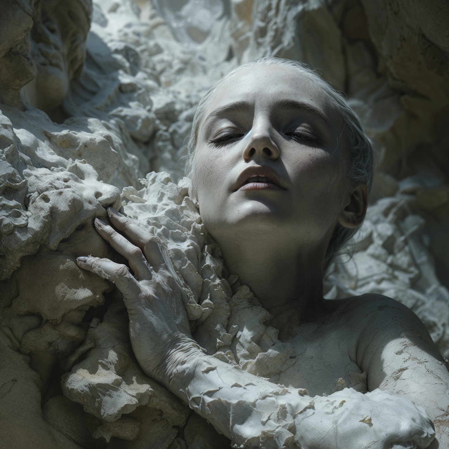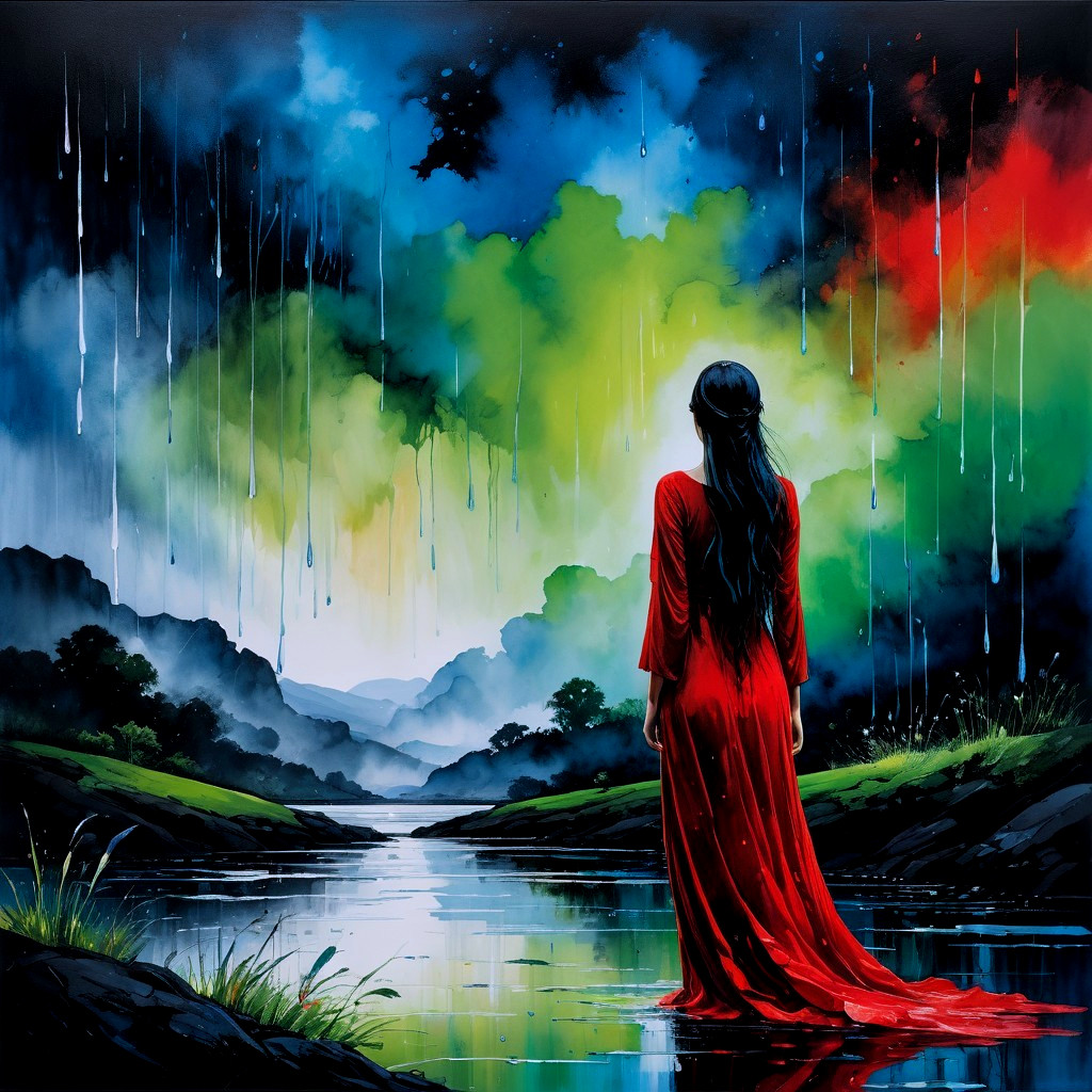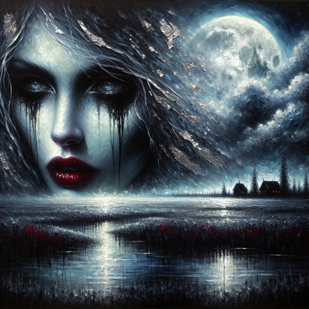 Prompt: A dramatic grayscale image of a young woman in distress, drenched in rain, with wet hair plastered to her face. She is leaning over emotional pain, with a look of anguish and despair. The focus is on her face and the droplets of water, with a blurred background suggesting a desolate, stormy environment. The style is cinematic, with high contrast and a focus on capturing raw emotion. The image should be of high quality, with fine details and a realistic rendering.