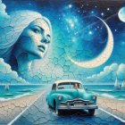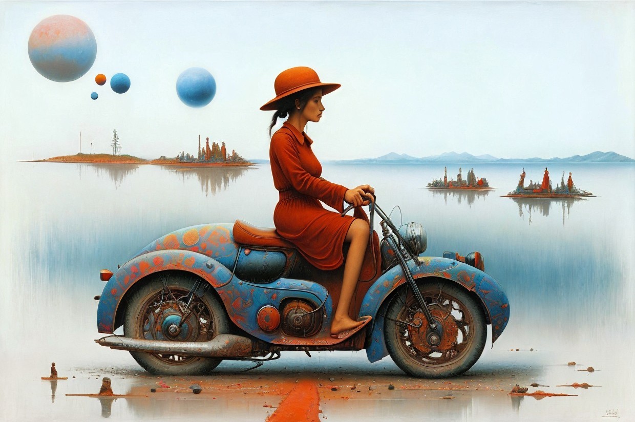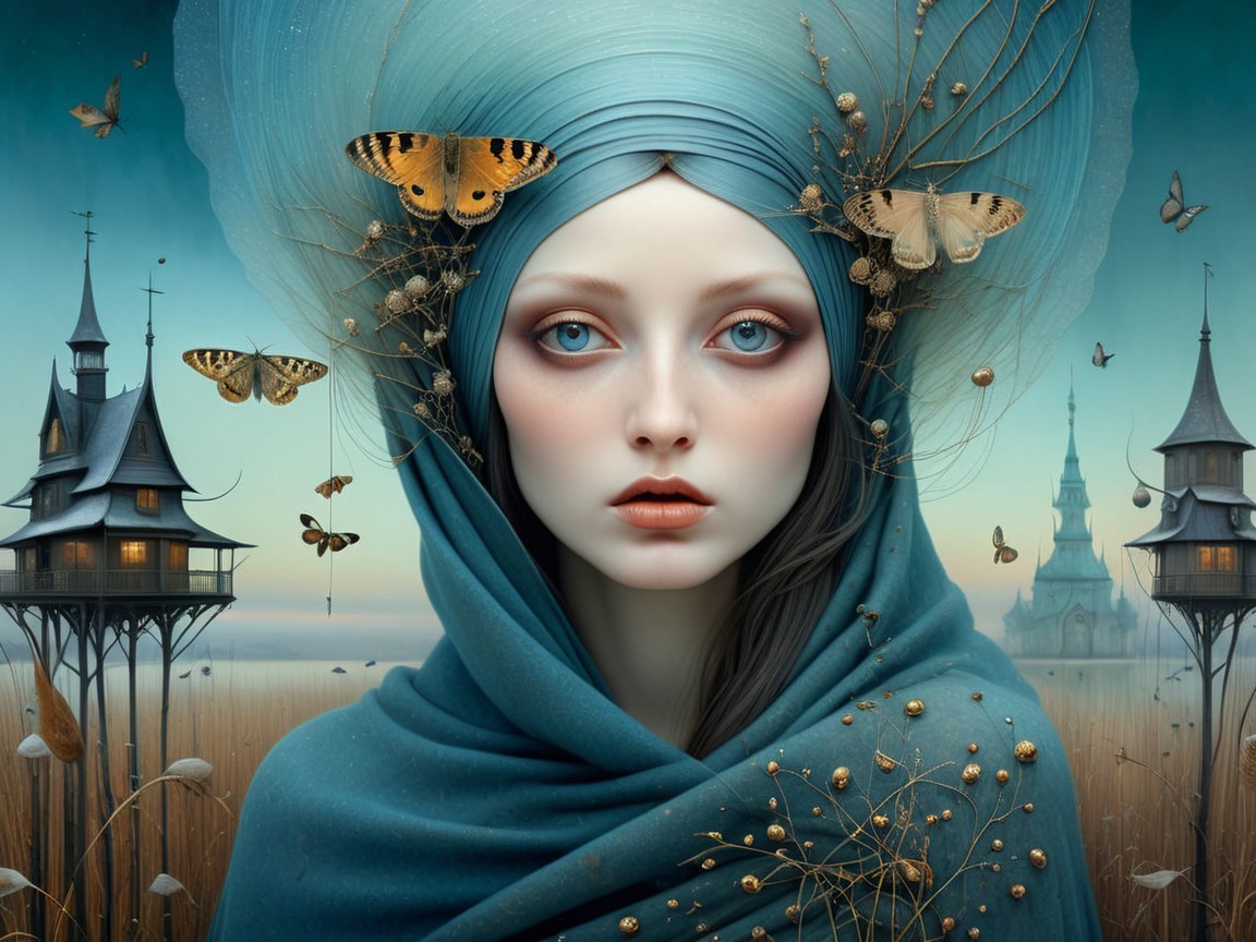 In the background, depict a surreal landscape with a winding path leading up a hill, lined with a gnarled tree that has vibrant orange leaves. On the horizon, include a mysterious, grand castle with tall spires disappearing into the mist. Above, paint a dramatic sky with two large, partially visible moons and fluffy clouds, creating an ethereal atmosphere. The color palette should feature muted earth tones contrasted with the bright orange of the tree, capturing the essence of a fantasy world.