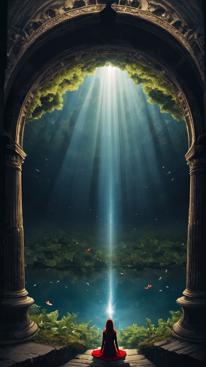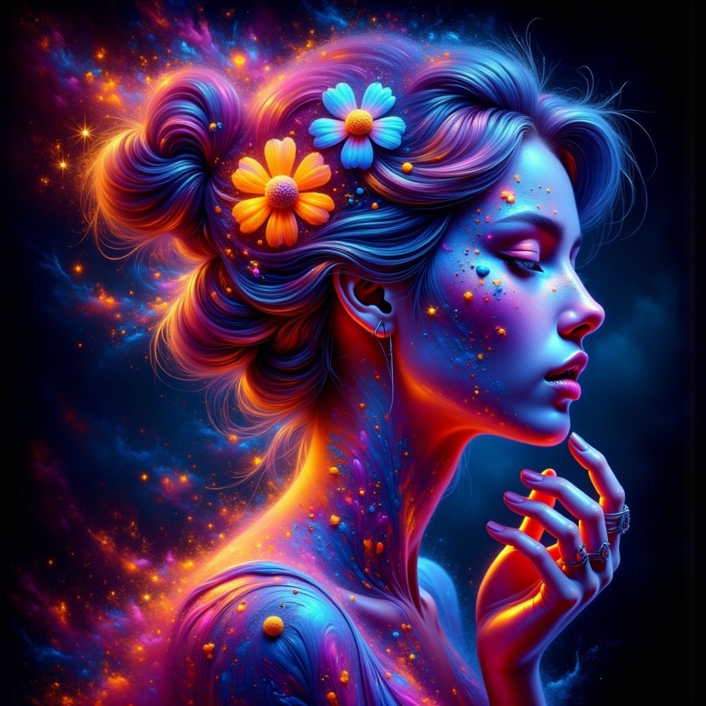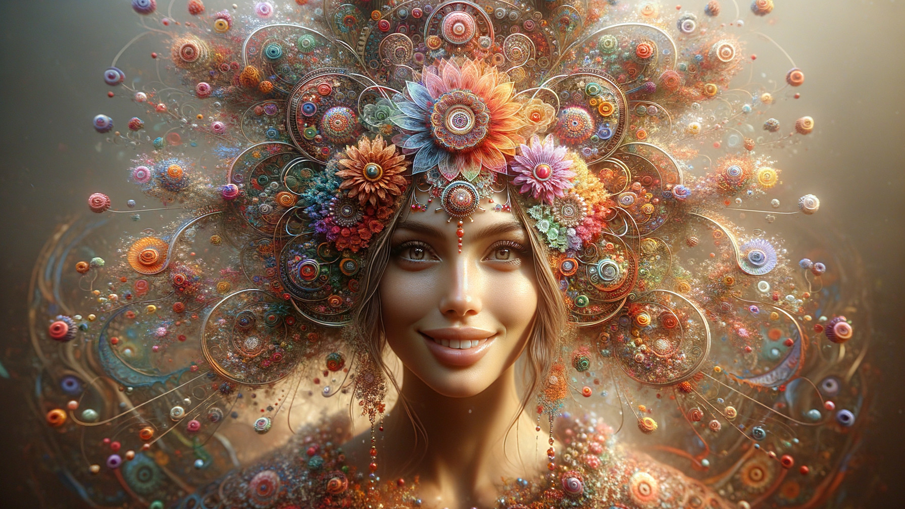 Prompt: The face of the enlightened Being who arrives through the Portal to higher dimensions of being beyond time in cymatic fractal design formed by solfeggio frequencies as eloquent architecture in the return to a harmonious Universe where the river of time meets the rocky shores of Space in a stunning colorful orbital Cathedral, the meeting place of ascended beings, in the style of Rembrandt.