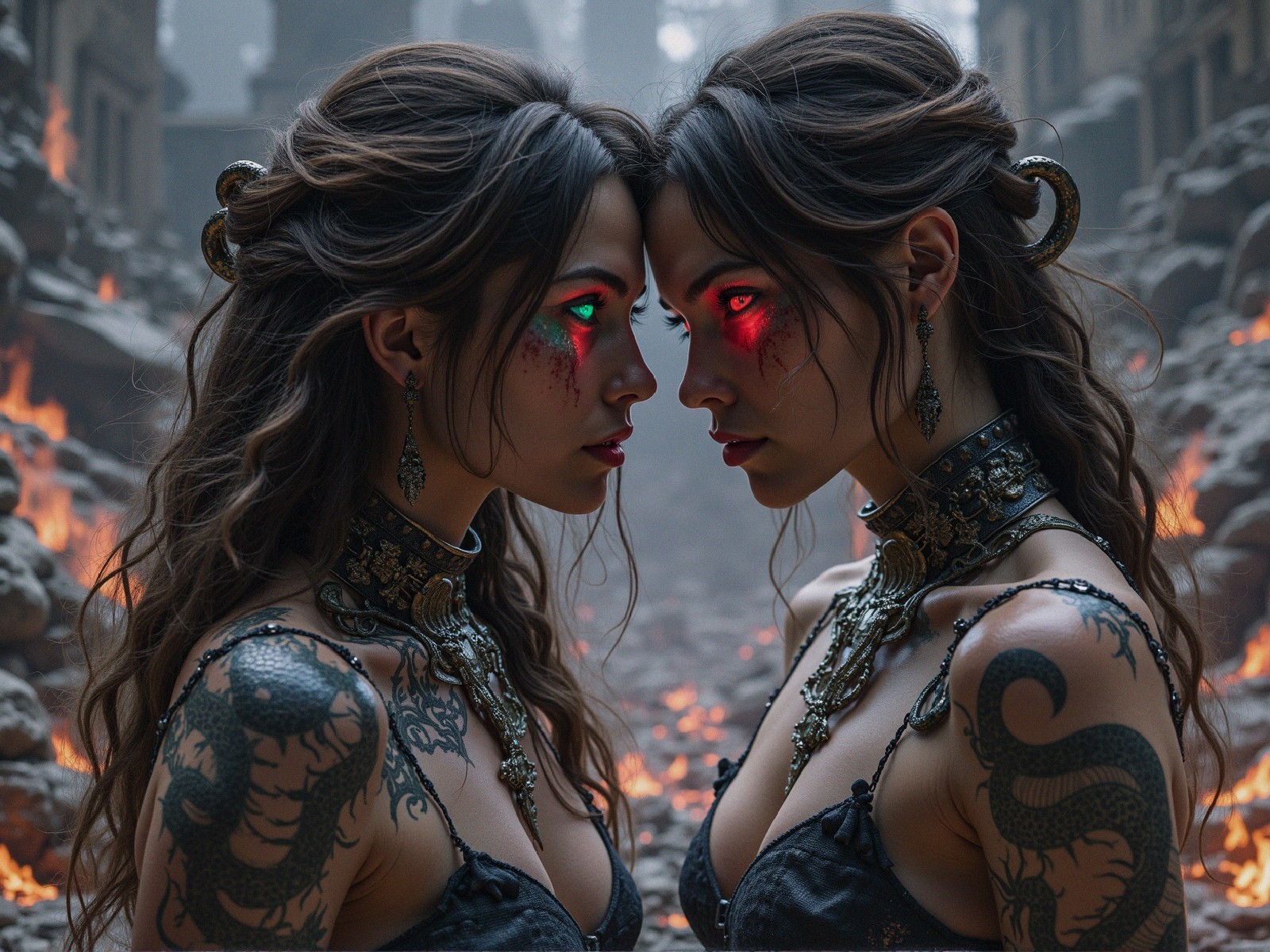Prompt: Fantasy artwork in the style of Roger Dean of Dejah Thoris standing next to a green eight-armed Giant in a fantastic Mars landscape with two moons in the sky