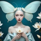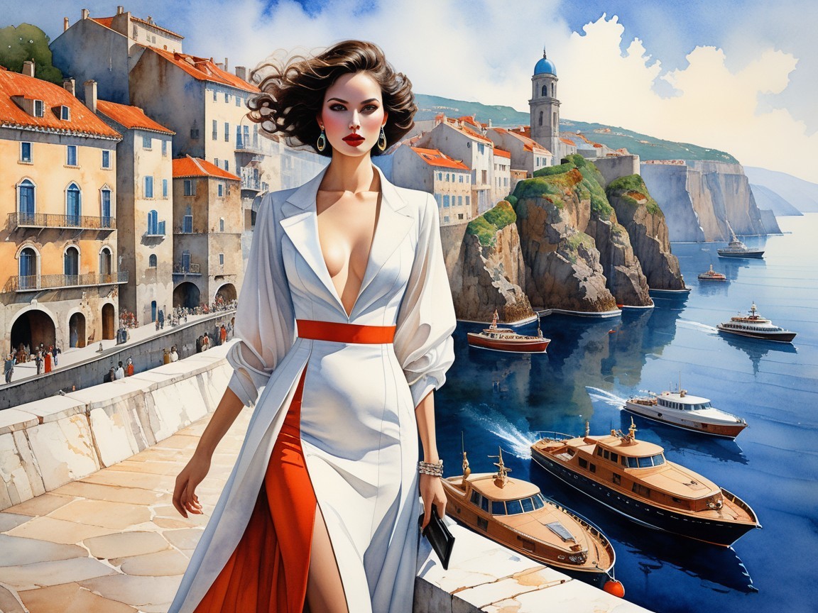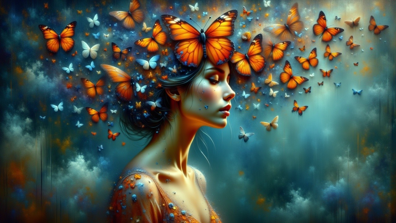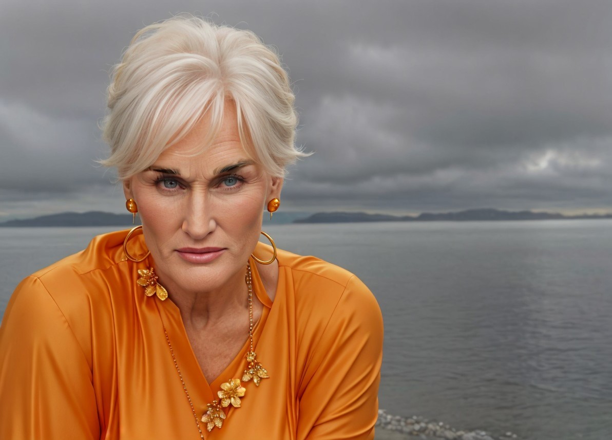 Prompt: Beautiful Glenn Close in a gorgeous glittery orange top with flower designed golden earrings and the background of a beautiful bluish grey cloudy scenery.