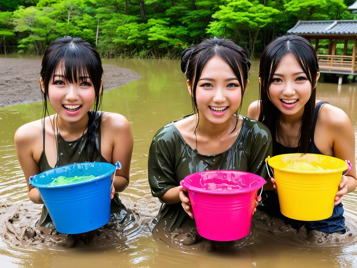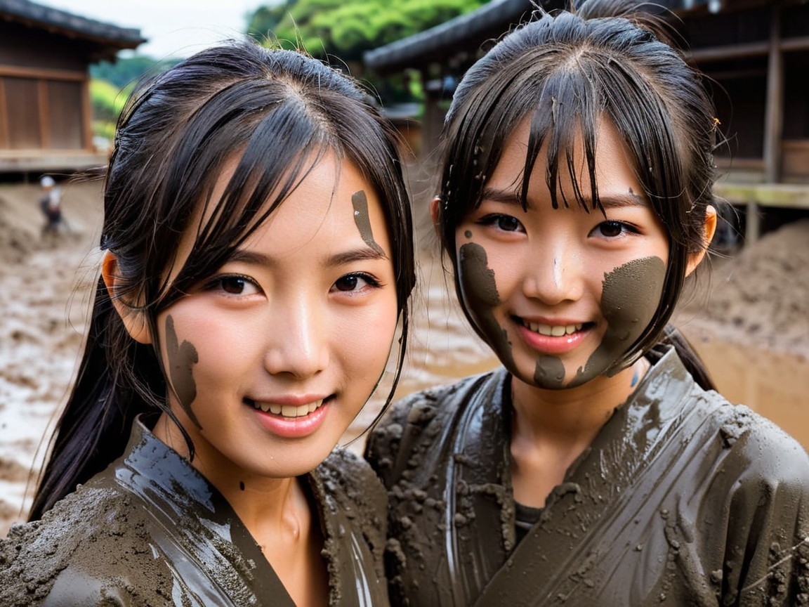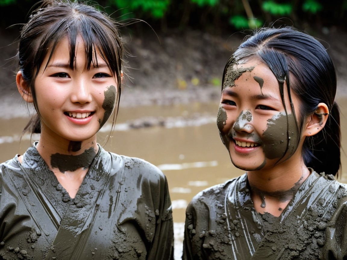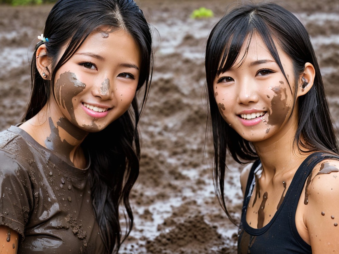 Prompt: Cute japanese girls in bikinis mash thick mud into each others hair and dunk their faces in mud. they are completely adorned head to toe in mud. their faces are completely adorned in thixk mud