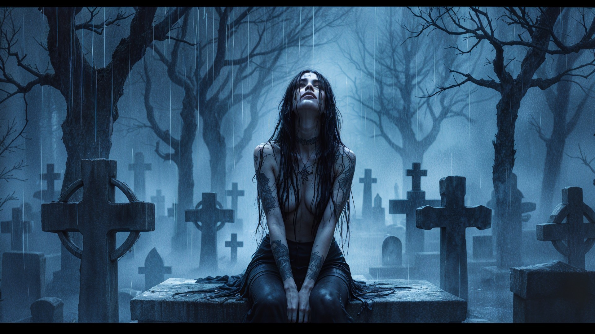 Prompt: 16:9 format of a delicate ink and watercolor wash rendering on rough handmade paper a dark, atmospheric scene set in a dense, rain-soaked cemetary at night. One gothic woman with long, black wet hair draped over her shoulders is sitting on a stone structure, gazing upward with a contemplative or hopeful expression. She is dressed in black clothing, with rain cascading down her face and body. She got black tattoes all over her body and a small facetattoo. The background features tall, jagged trees with sparse, dark foliage. The scene is illuminated by a faint, cold blue light, emphasizing the rain and mist, creating a mysterious and moody ambiance.The Image is captured from a distance.