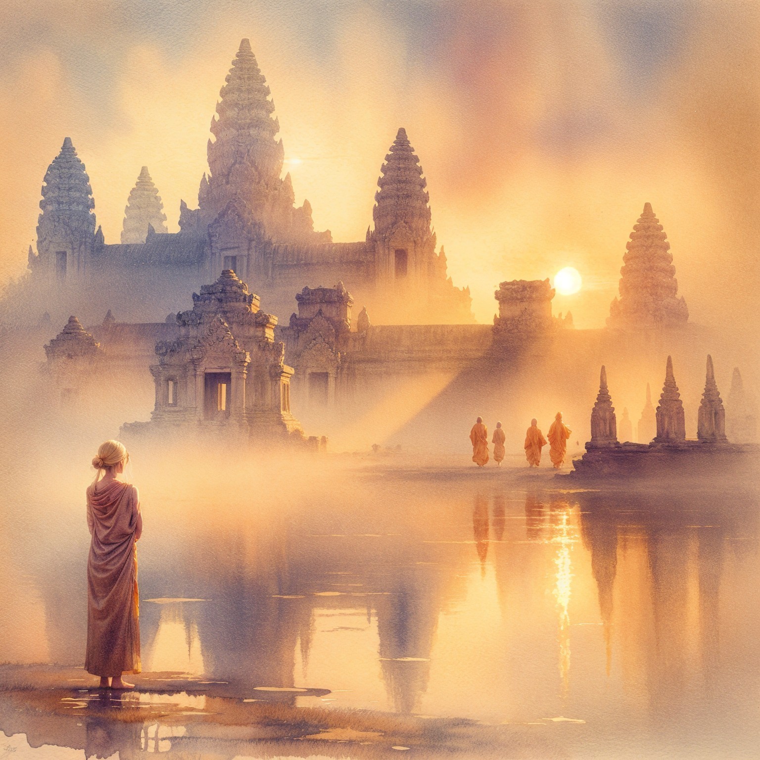 Prompt: Soft watercolor scene of Angkor Wat at sunrise, bathed in golden mist. The ancient towers rise from the reflecting pool, their silhouettes mirrored perfectly in the calm water. Gentle shades of rose, gold, and pale blue blend in the early light. A blonde woman with pink glasses stands quietly at a respectful distance, watching the reflection shimmer. Around her, a few distant figures — monks in saffron robes and early travelers — move softly through the haze. The air feels sacred and timeless, filled with warmth, dew, and whispered prayers.