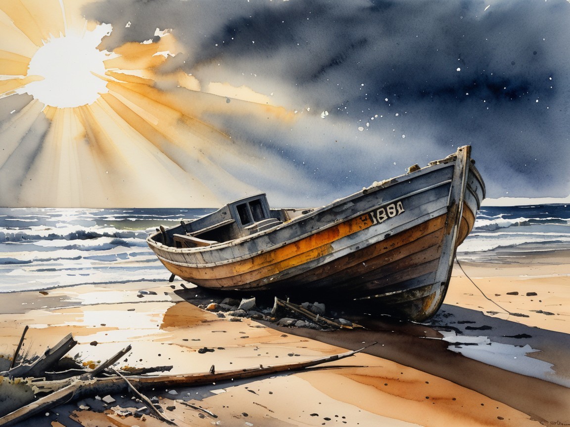 Prompt: Impressionist Watercolor and ink, alcohol wash, very loose brushstrokes. An abandoned decaying colored boat on the shore. The sea is dark with foamy waves, the sky is dramatic, with some sun rays peeking out. Strong light contast in the tones of ocher and Payne's gray