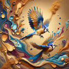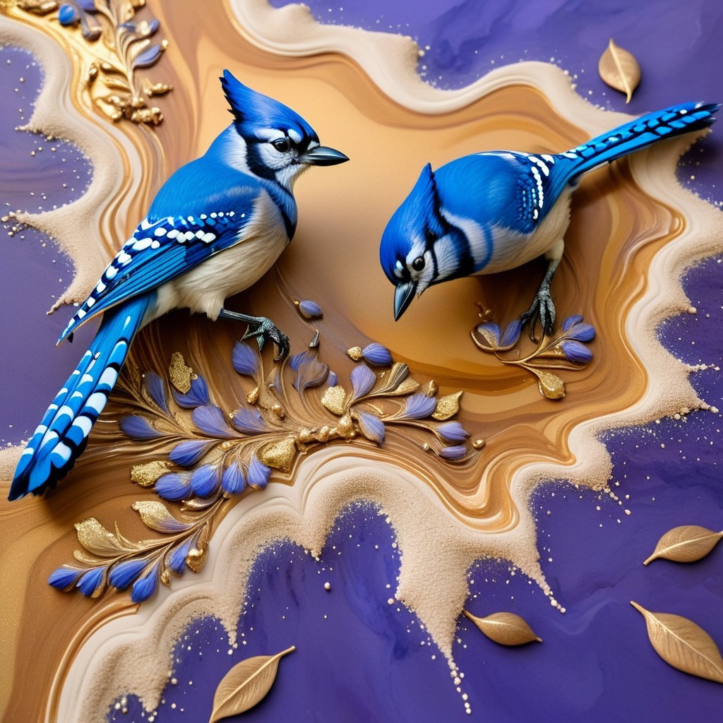 Prompt: Bluejay, a masterpiece in fluid art technique, using multi-layered liquid acrylic pours, pigments, golden sand, antique gold leaf, and glitter. To add texture, relief, and volume, also use a set of knives. Apply colors Shiny metals (golden brown, amber, blue olive, purple, muted terracotta, pistachio, coffee with milk, red, teal blue) one after the other, using the Acrylic Pouring Dip and sandwich acrylic pours technique. In the corner of the painting, made of sand and spilled paint, a smooth abstract pair of two bluejays takes flight with their wings spread wide. Style of Catherine Hyde, Odilon Redon, Anne Bachelier, PiCrate, Gustav Klimt, Jeffrey Tover, Duy Huyn, Mandy Disher, Cecilia Frigati. Full-size format no cropping, no frames, no text. highly detailed sharp focus elegant fantasy beautiful dynamic lighting high definition crisp quality acrylic art Gustav Klimt Surrealism Odilon Redon Fluid Art Carne Griffiths Esao Andrews mixed media painting Art & painting abstract art digital Acrylic Pouring Dip puruing acrylic art Tzviatko Kinchev --c 50 (chaos 50) Layering and glazing technique chiaroscuro technique Melanie Howells Full size, no cropping, no borders, no text or copyright. piCrate (Jean-Michel Péricat)