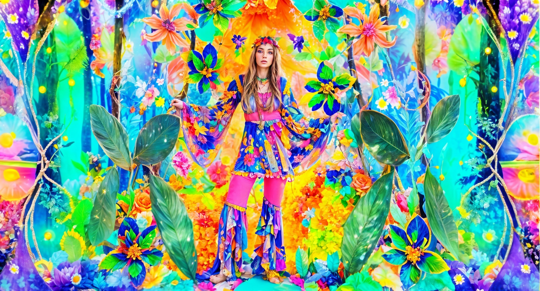 Prompt: Shabby chic and boho style, charming hippie and boho babe, blonde hair under the fir tree branches, long white eyelashes, white super-long hair