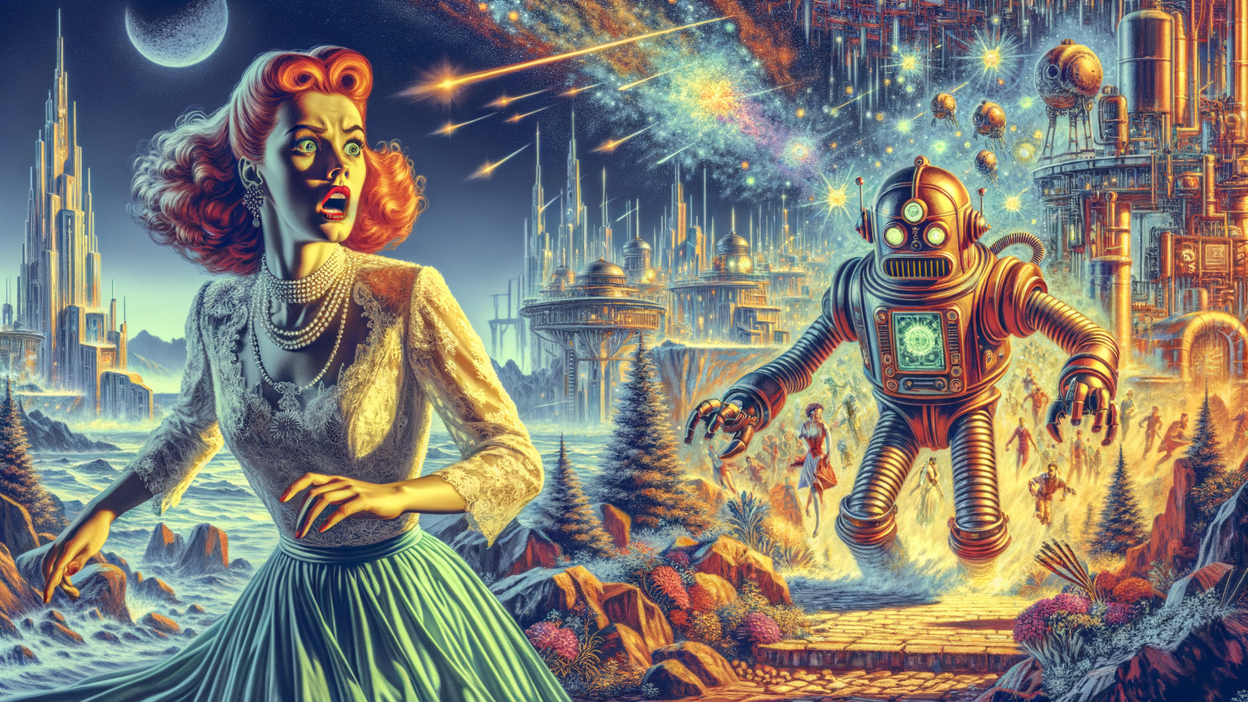 Prompt: A 1950s SCI-Fi scene of a terrified, gorgeous, redhead "Buck Rogers/ Gil Elvgren style woman", being chased by an angry looking, 1950s style Robot. An ultra-detailed, colorful, beacon of fantasy, with the artistic styles of George Pal, Kelly Freas and Frank Frazetta. It is an elegant fantasy world with intricate, highly detailed, and colorful 4K 3D imagery. VRay