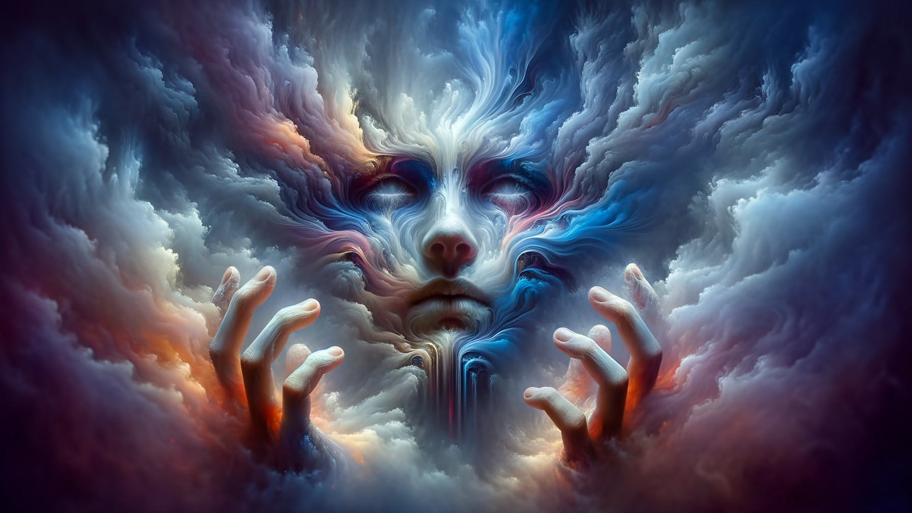 Point Focal Principal : Au cœur d'une brume en mutation, un visage et des mains se révèlent, portant une émotion complexe de transition. C'est un mélange de peur profonde face à l'inconnu, de résignation douce face à un destin imminent, et d'une force intérieure naissante. Cette émotion, intime et universelle, doit capter l'observateur.