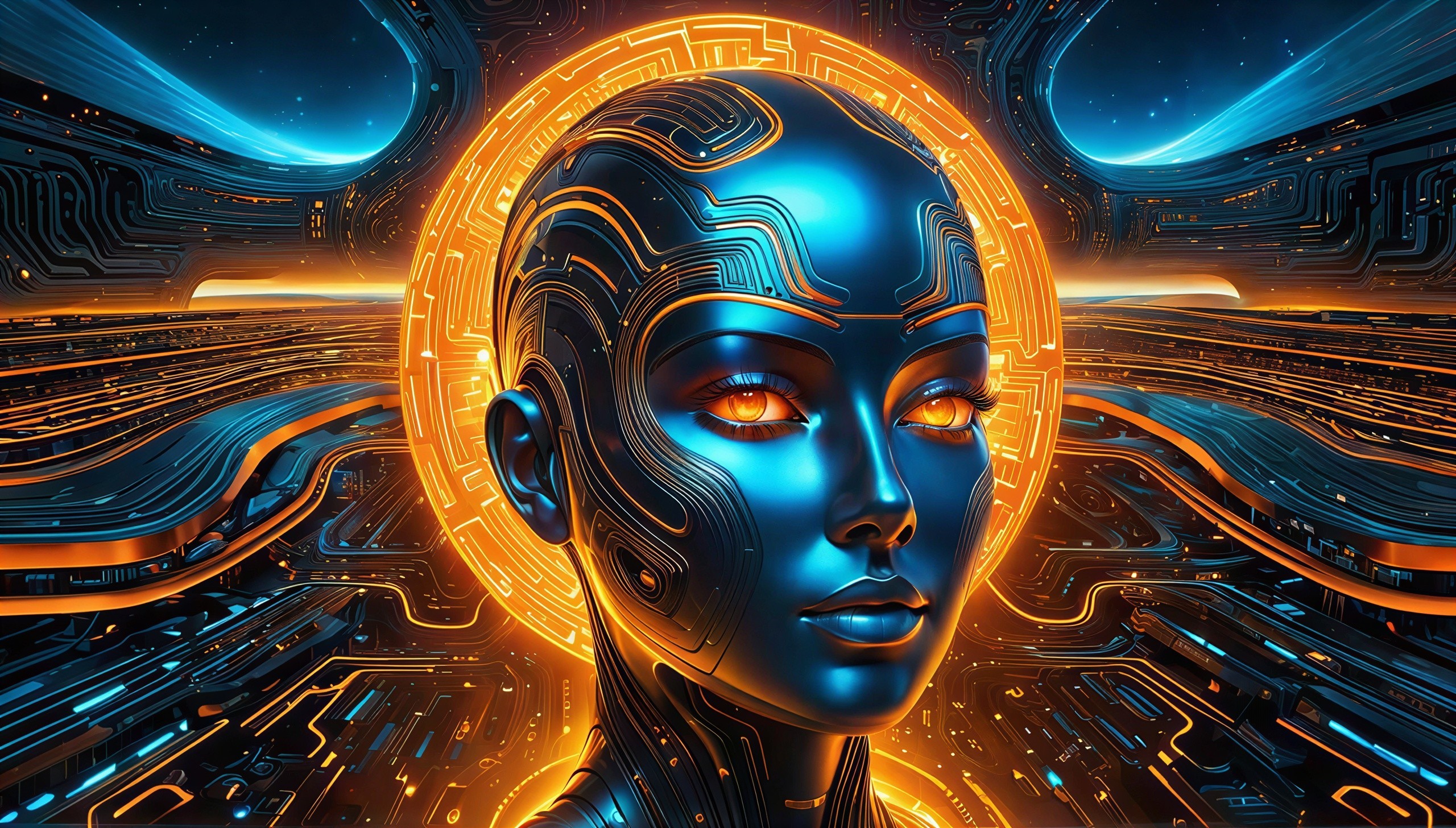 Prompt: A striking close-up portrait of a woman's face, bisected vertically to showcase stark contrast. One side presents a monochrome rendition: pale skin, shadowed eyes with dramatic black eyeliner, thick black eyebrows, and dark, matte black lips. The eye of the monochrome side is focused, creating an intense, enigmatic gaze. In contrast, the other half of the face explodes with color, a geometric composition of vibrant hues. The eye on the colored side possesses striking blue irises, surrounded by meticulously arranged segments in shades of orange, yellow, pink, blue, green, and purple, mirroring feathers. (The lips on the colored side are a bright, glossy pink). The face's skin is smooth, showing no blemishes. The lighting is balanced, softly illuminating the monochrome side while highlighting the brilliance of the colored segment. The background is a soft, muted grey, providing a neutral backdrop. The style is a blend of geometric abstraction and photorealism, reminiscent of art deco and pop art, achieving a modern, stylized aesthetic.