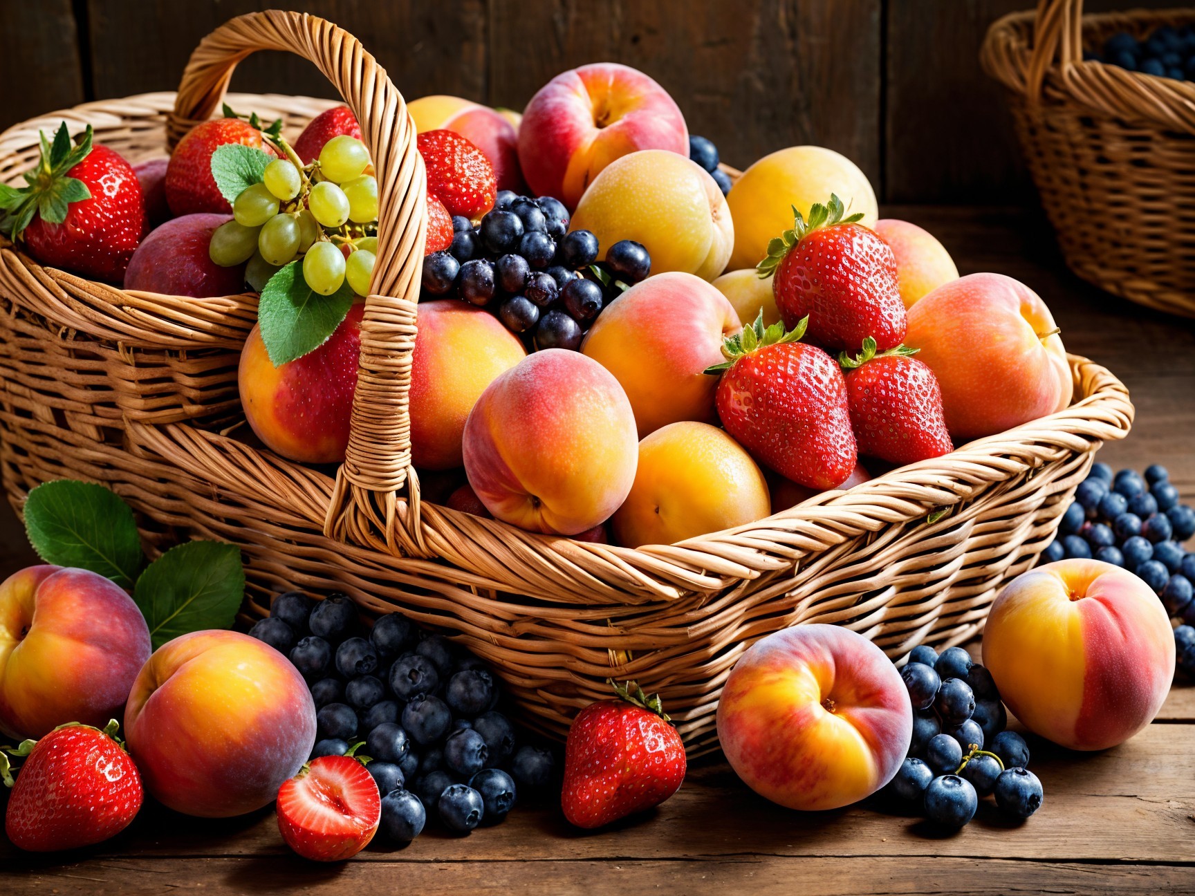 Prompt: Juicy ripe fruits, a vibrant mix of strawberries, blueberries, and mangoes, glistening with freshness, scattered on a rustic wooden table, a wicker basket overflowing with colorful peaches and grapes, natural lighting enhancing the vivid hues, a hint of dew on the fruits, rich and varied textures, luscious and tempting, close-up view capturing the intricate details, high-resolution for crispness, a summery and bountiful harvest scene.