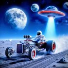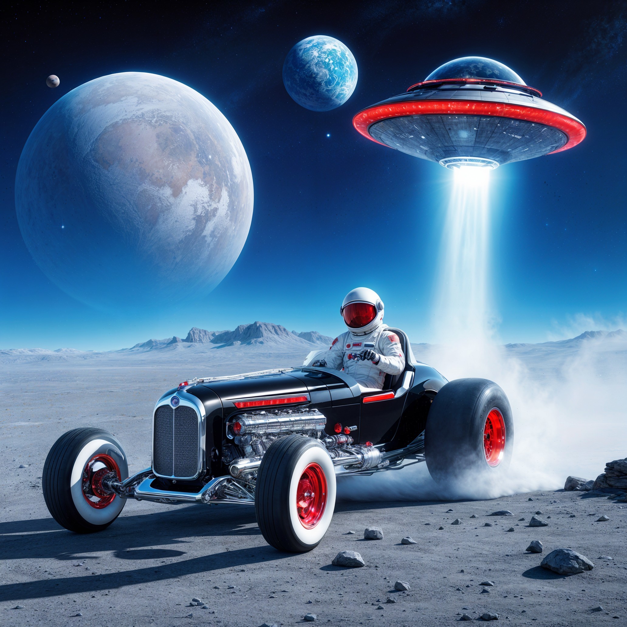 Prompt: 2025 Outer-Space Hot-Rod, Perfect, hemi-engine uncovered, black glossy painted, red accents, pearl-white leather interior, white-wall wide rugged tires, red glossy tire-rims, chrome hub-caps, neon-red tire spinners, chrome finished, white astronaut-suited driver, racing on a desolate planet, red head-lights are on, green Aura-glow around the hot-rod being chased by a glowing alien space-saucer, background is dark cosmic space, other planets can be seen in the distance, Perfect, 32K resolution