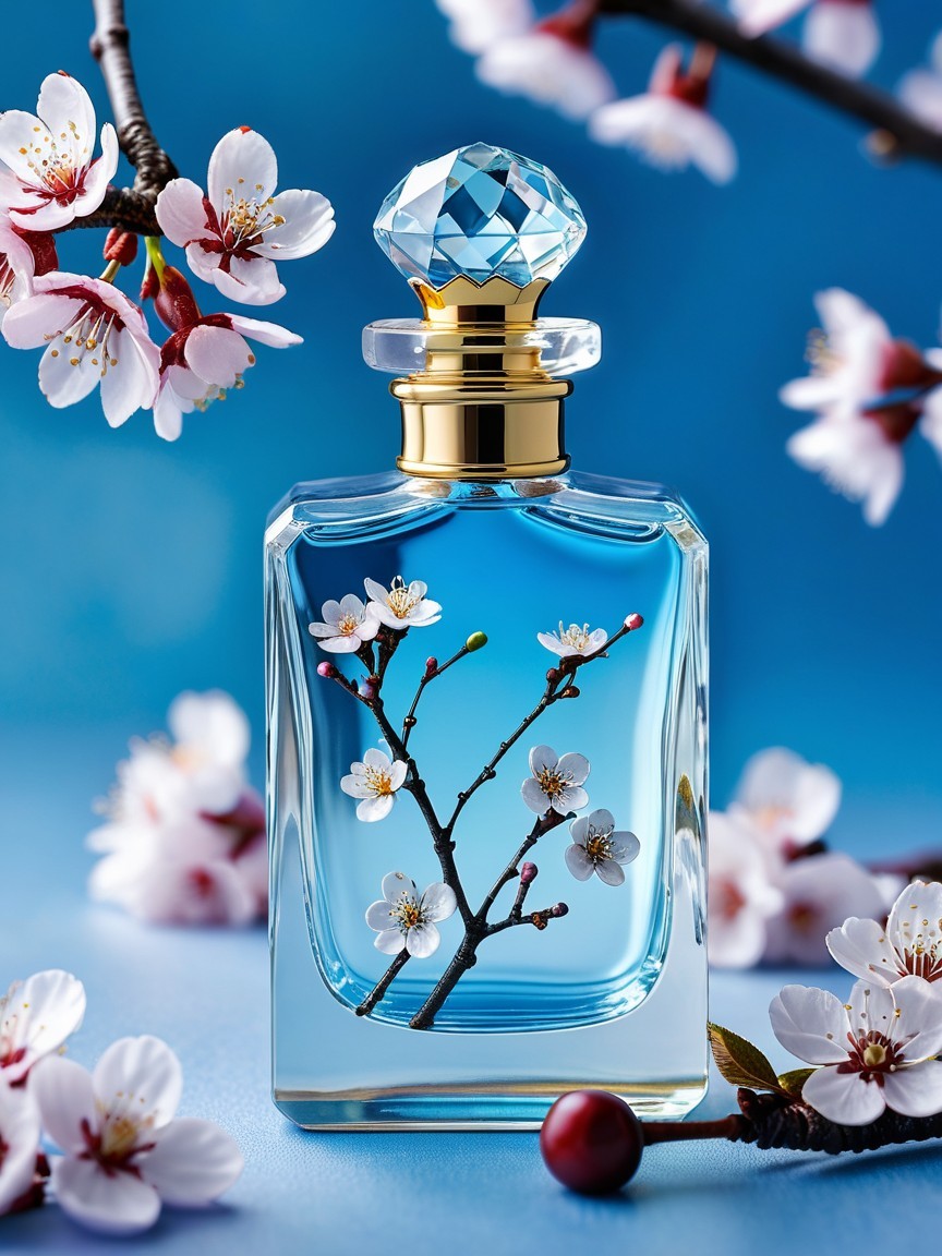 Prompt: A glass perfume bottle, its stopper adorned with a sparkling gemstone, sits amongst a vibrant cluster of mini blue blooming cherry blossoms against a soft, blue background, captured in a close-up shot, HQ masterpiece unbelievable mixed artists