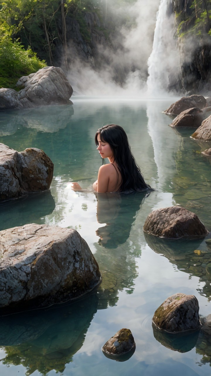Prompt: A breathtaking portrait of a woman sculpted from ethereal, flowing flames, her form a perfect fusion of human grace and fiery energy. Her translucent body radiates with warm hues of gold, orange, and crimson, while faint streaks of blue and white fire dance along her edges, shimmering like molten glass. The scene is bathed in soft, golden-hour lighting, with a glowing atmosphere enhanced by particles of light drifting through the air. The woman's fiery gown flows like liquid fire, trailing behind her with intricate, swirling details that feel alive and full of motion. Her piercing, otherworldly gaze captivates, exuding strength and sensuality.