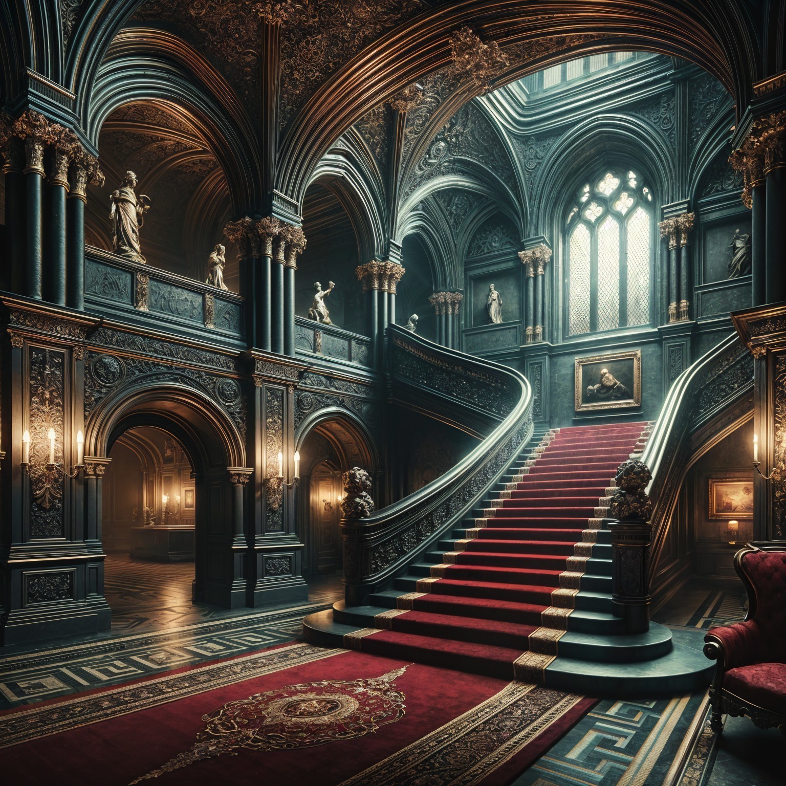 Prompt: Create an image of an opulent, gothic interior scene featuring a grand staircase. The staircase, elegantly curved, is covered in a rich, red carpet that contrasts with the dark, intricate woodwork of the railing. The surrounding architecture is characterized by high, vaulted ceilings adorned with intricate designs, and ornate chandeliers hanging above, casting a soft light across the room. The walls are embellished with dark stone and dramatic arches, and several classical statues are positioned strategically along the walls, hinting at a sense of history and grandeur. The atmosphere is moody and atmospheric, conveying a sense of both elegance and mystery, with shadows deepening the contrast in the dim lighting.