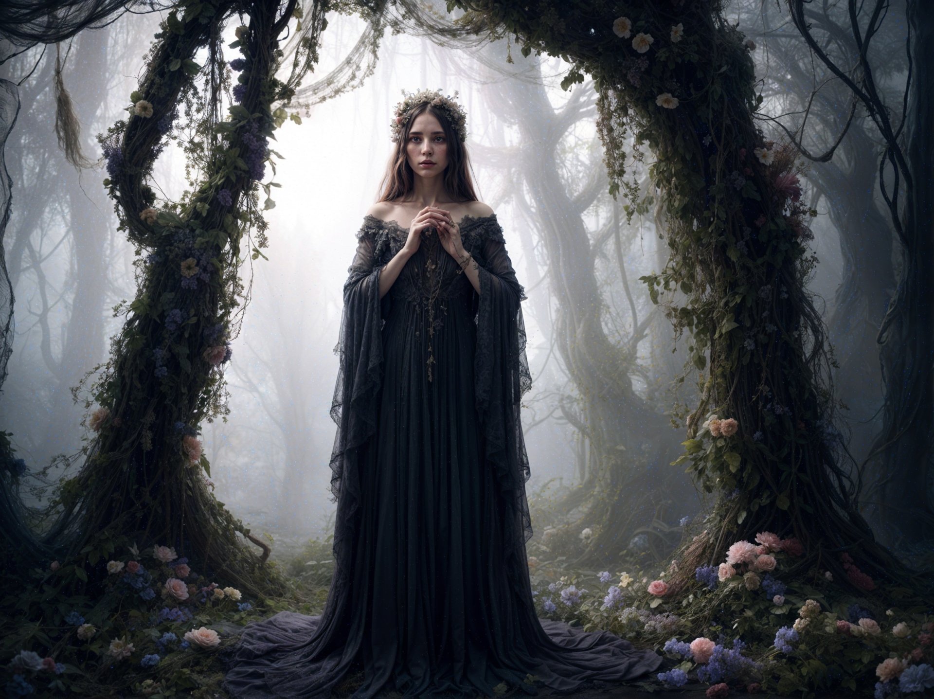 Prompt: Mysterious spiritual girl, draped in flowing, diaphanous garments adorned with wilted flowers and vines, stands amidst a surreal, dystopian landscape, surrounded by eerie, glowing anomalies and distorted, ethereal elements, as if summoned from a dream. Her presence is otherworldly, with an air of mystique, reminiscent of Hieronymus Bosch's fantastical creatures. Her attire is a blend of whimsy and darkness, with intricate, lace-like patterns and tattered, translucent fabrics, evoking the haunting, gothic style of Zdzisław Beksiński. The atmosphere is heavy with foreboding, as if inspired by the bold, expressive brushstrokes of Francisco Goya, with vibrant, jewel-toned hues and deep, rich shadows. The image is vertically composed, with a sense of unease, like a tintype photograph, with cracked, analog errors and databending distortions, as if the very fabric of reality is unraveling. The girl's form is rendered in exquisite, hyper-real detail, with fine, glass-like textures and an extravagantly detailed, watercolor-inspired aesthetic, as if captured through the lens of Ellen Von Unwerth's Nikon D850, with award-winning, cinematic postprocessing. The overall effect is one of haunting, atmospheric beauty, with an 8k resolution that invites the viewer to step into the mystical, dark fantasy world.