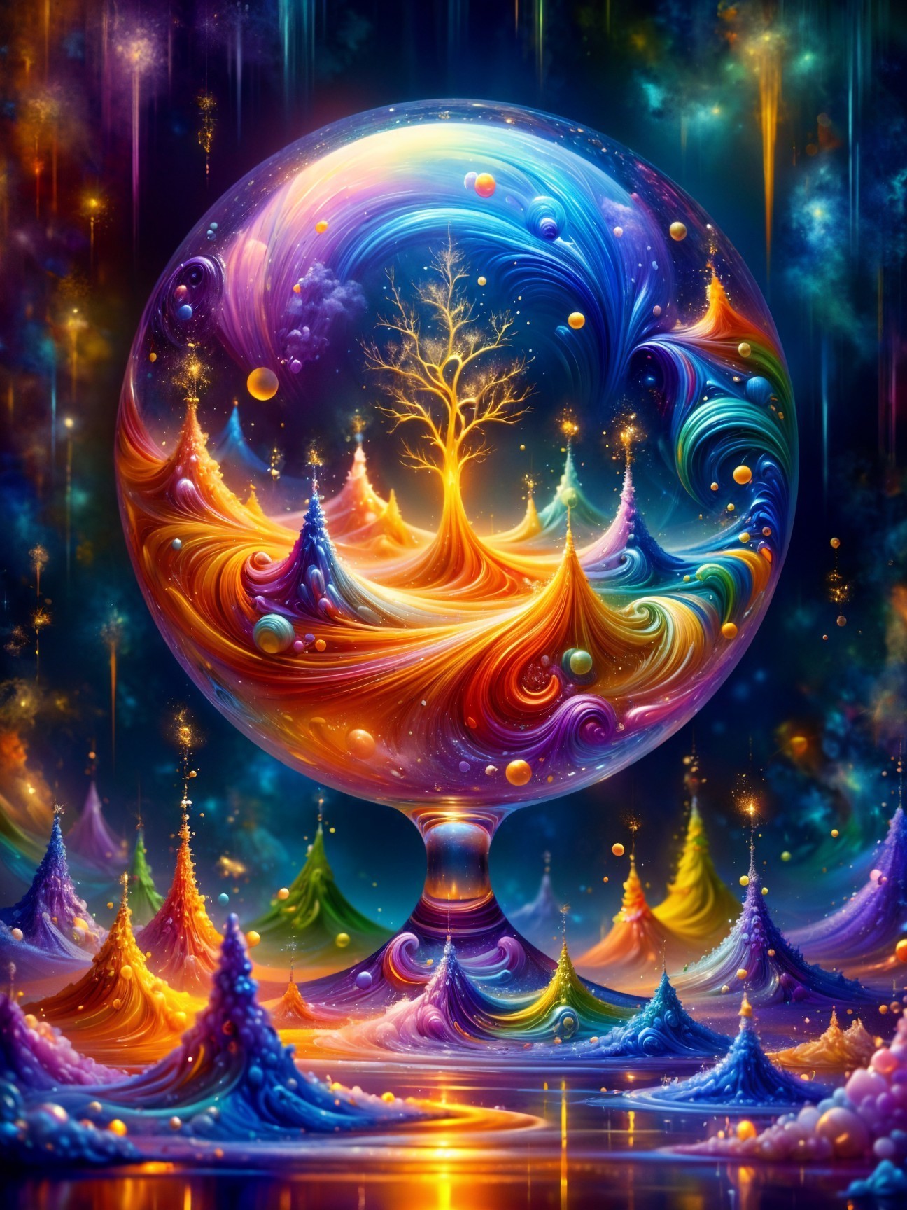 Prompt: Golden tree as centerpiece, vibrant purple and red hills, dark towering mountains, starry night sky with multiple moons, surreal and mystical ambiance, enchanting fantasy landscape, digital art, detailed and colorful, surrealism with a touch of mysticism, dreamlike setting, by Alex Grey and Salvador Dali, Artstation.