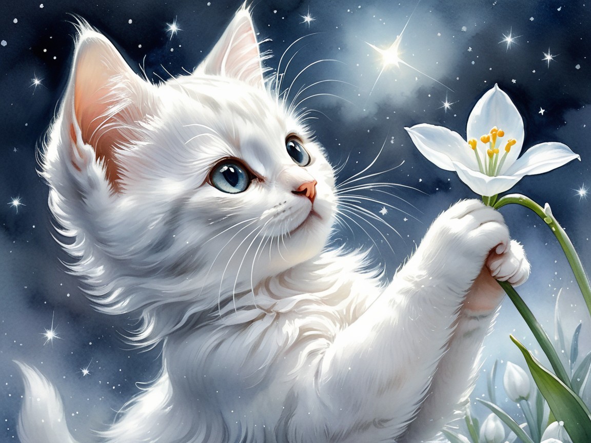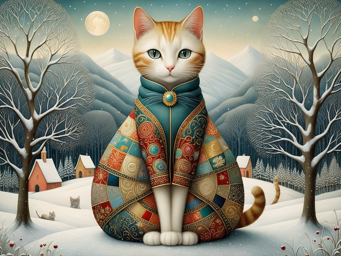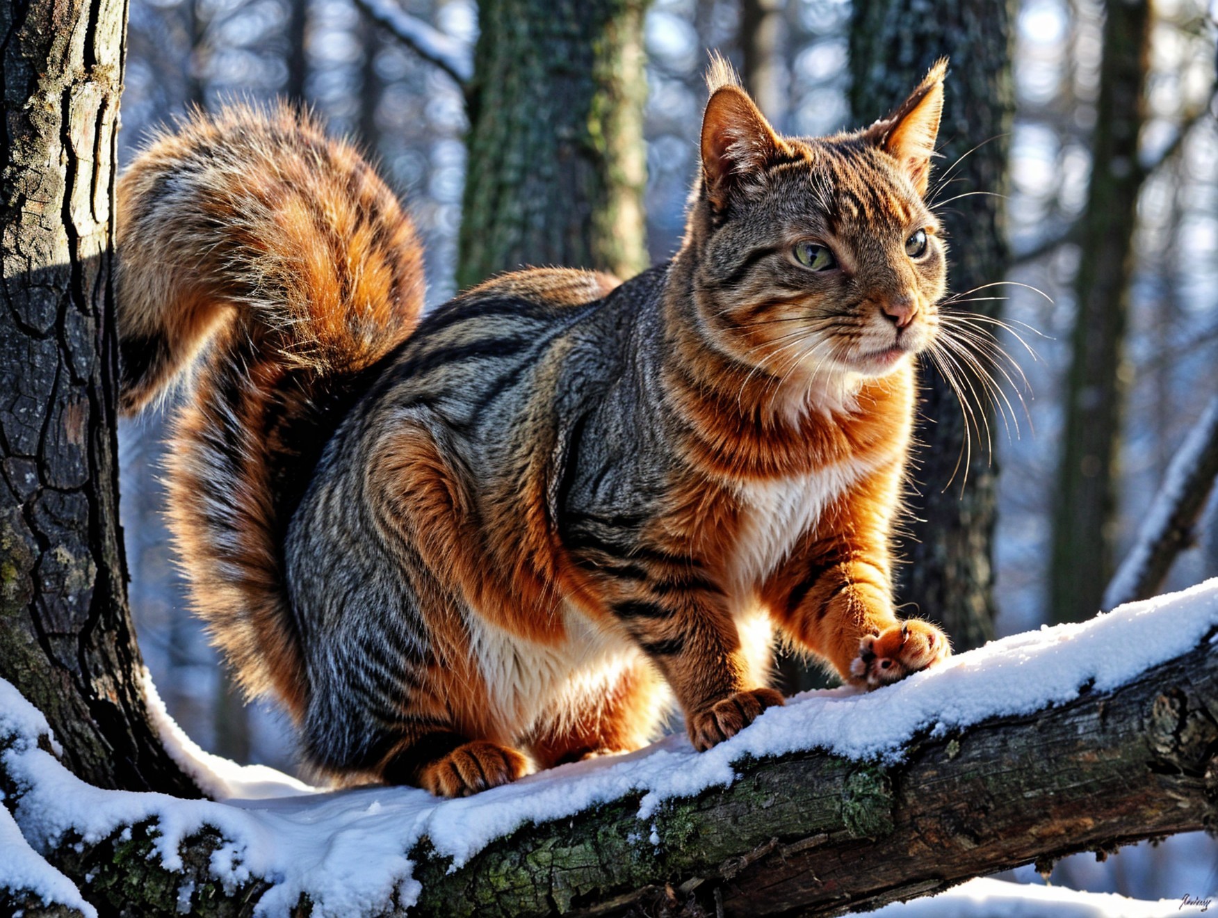 Prompt: Two whimsical, long-necked cats with large, expressive eyes sit side by side, gazing curiously at a vibrant butterfly fluttering nearby. Their tails are curled with bold black-and-white stripes, adding to their quirky charm. The background is a playful mosaic of pastel-colored blocks, creating a textured and dreamy atmosphere. Colorful, delicate butterflies surround the cats, enhancing the enchanting and joyful mood of the scene. The overall art style is lighthearted and whimsical, with soft, surreal shapes and an imaginative, playful energy