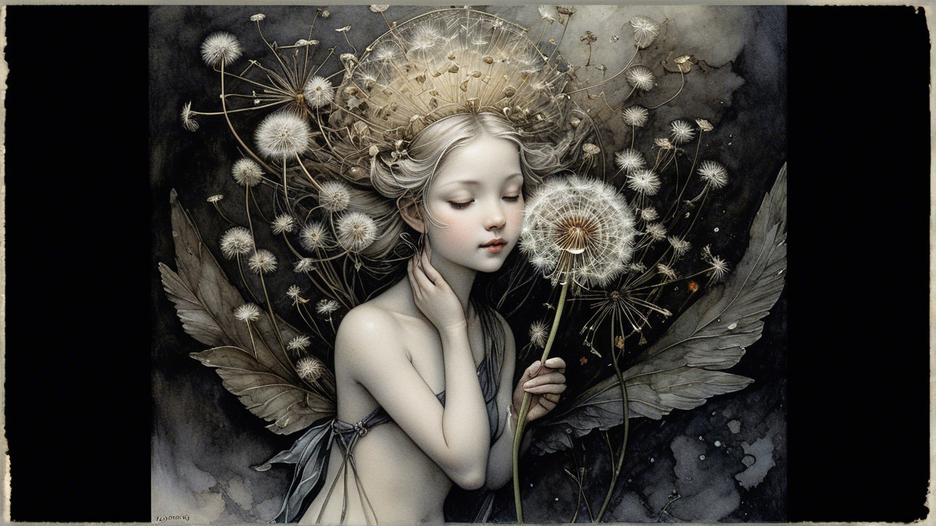 Prompt: Portrait of a woman turning away from the viewer, her long dark hair threaded with faint green, memory of youth slipping away. Her form dissolves into drifting charcoal mist. Noir watercolor, soft edges, emotional abstraction.