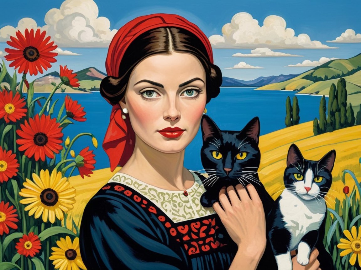 A "Tulip Guardian" hybrid, painted with the layered depth of Jan van Eyck, the chaotic energy of Jackson Pollock, and the clean lines of Josef Albers, protects a grove of luminous flowers. Explore themes of protection, sanctity, and the role of a divine caretaker. (Focuses on layered depth, chaotic energy, and clean lines; explores protection and sanctity.)