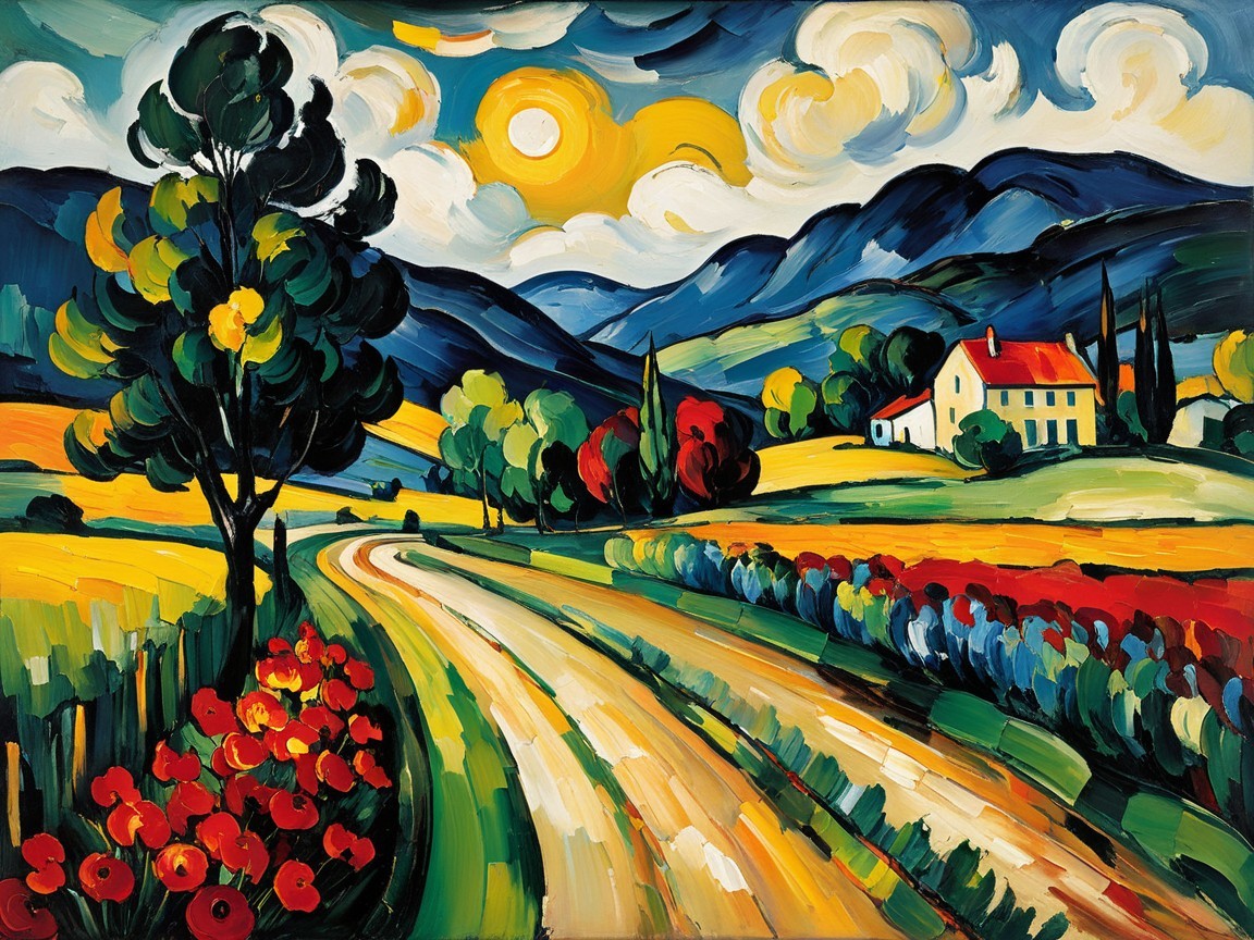 Prompt: Maurice de Vlaminck. The work belongs to the artist's Fauvist period, characterized by the use of bright colors. The painting depicts a lush landscape.