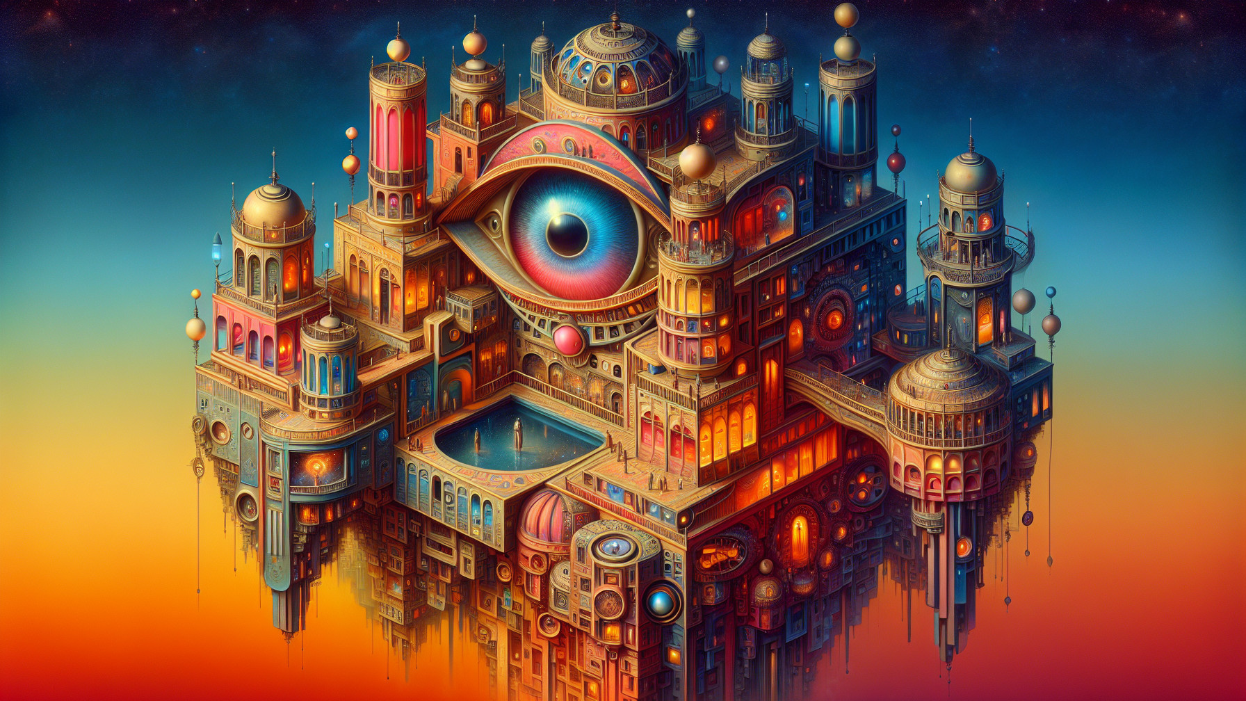 Prompt: ((Masterpiece)), ((A surreal masterpiece depicts a solitary figure in a vast desert, surrounded by a cluster of vibrant eyes connected by tendrils. The scene evokes awe, featuring soft lighting and intricate details. The surreal, dreamlike composition features hyper-realistic details and a magical atmosphere), Use 1980s Retro Psychedelic Style, By Debbie Criswell, Catrin Welz-Stein, Gediminas Pranckevicius, Kate Beaton, Deborah Azzopardi, Laura Callaghan.