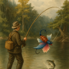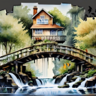 Prompt: watercolor painting depicting a serene forest landscape. The foreground features a flowing river with sparkling blue and white reflections. The midground showcases lush green foliage and tall, dark evergreen trees. The background includes misty, blue-gray mountains. The painting uses soft, blended brushstrokes and a natural color palette, creating a tranquil, atmospheric scene.