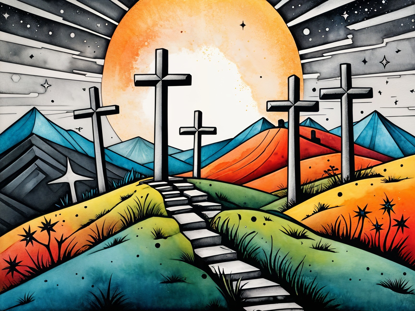 Prompt: picture: cartoon three crosses on a hill, splash ink technique aquatint, silver embossed metallic and fine intricately, detailed, black ink lines over the watercolor effects, geometric patterns on them, intricate, detailed, crisp quality, Colorful, tribal complementary color scheme, susanne2style,