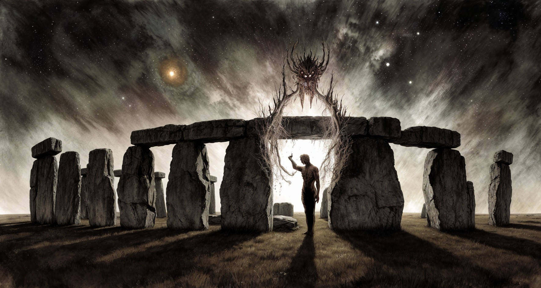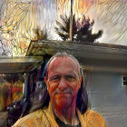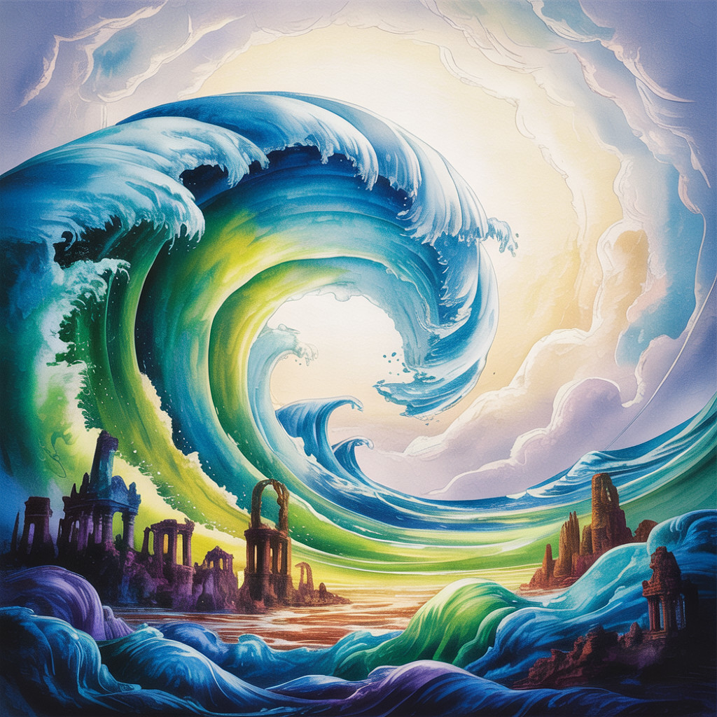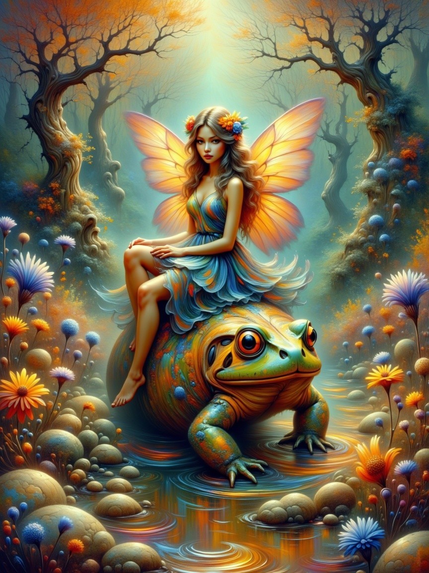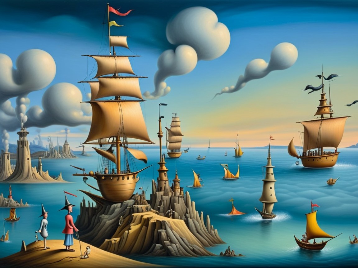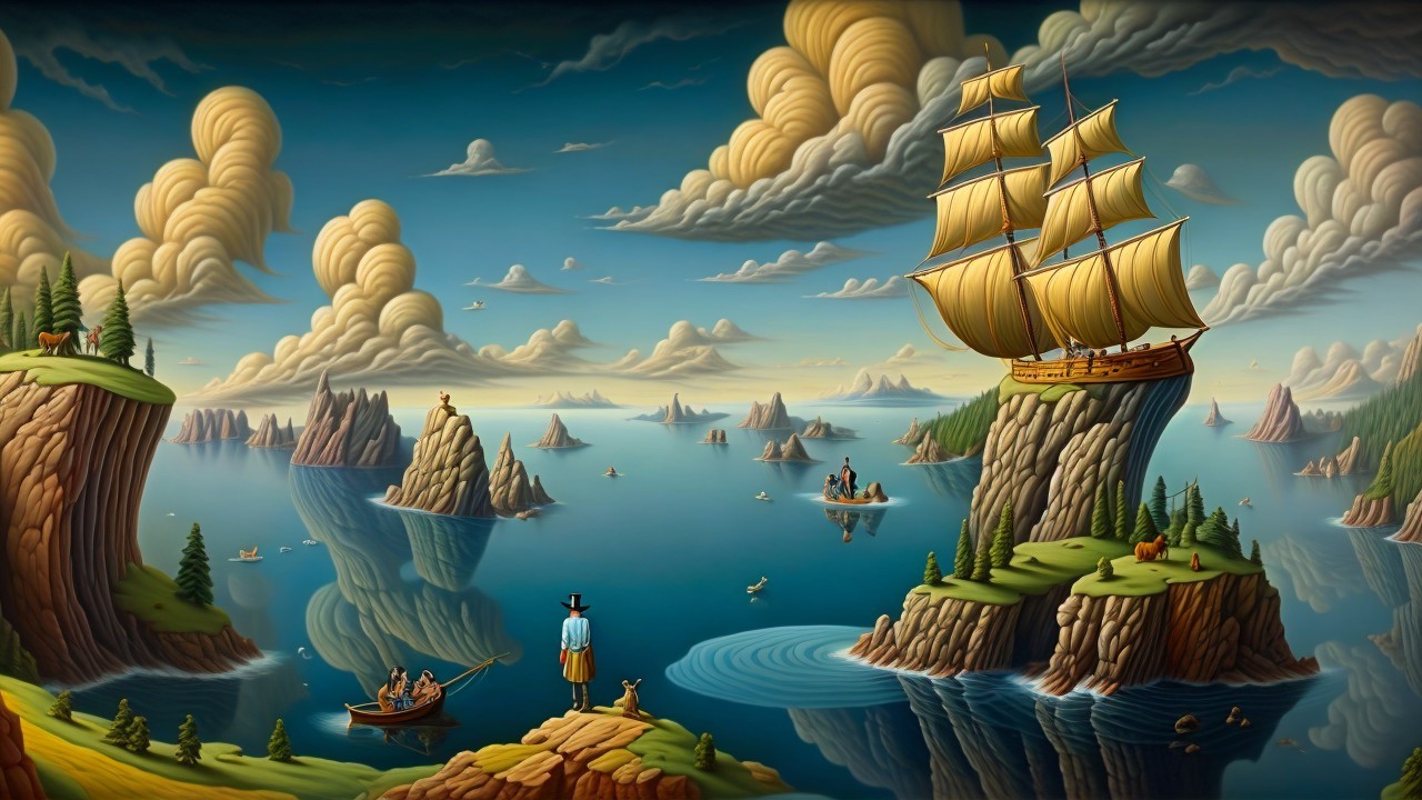 Prompt: A surreal painterly scene set along a strange, weather-worn old man, in the distance, the body is old he rests partially embedded in the land. The ocean pours forward in a continuous surge that spills across cracked soil, as though the tide itself has been redirected from its natural path. Within the translucent segments of the terrain, a silver river winds through shifting inner realms, revealing glimpses of soft misty forest light and shallow glowing water, each layer suggesting hidden depth beneath the surface. Along one side of the scene, he sits beside an ancient majestic, sprawling hyper-textured branches of an old oak tree with dead leaves, its fractured structure subtly mirrored across the aged and weathered surfaces surrounding it. Thick roots coil around the lower shell of the hull, binding it securely to the ground as if nature has claimed and preserved it over time. The composition carries the tonal discipline of the old masters, supported by a warm inner radiance that gently illuminates the central forms. A quiet, desaturated background reinforces the scene’s sense of stillness, while the overall visual language includes stylistic influences reminiscent of renowned surreal and painterly artists, emphasizing depth, texture, and refined atmospheric detail.