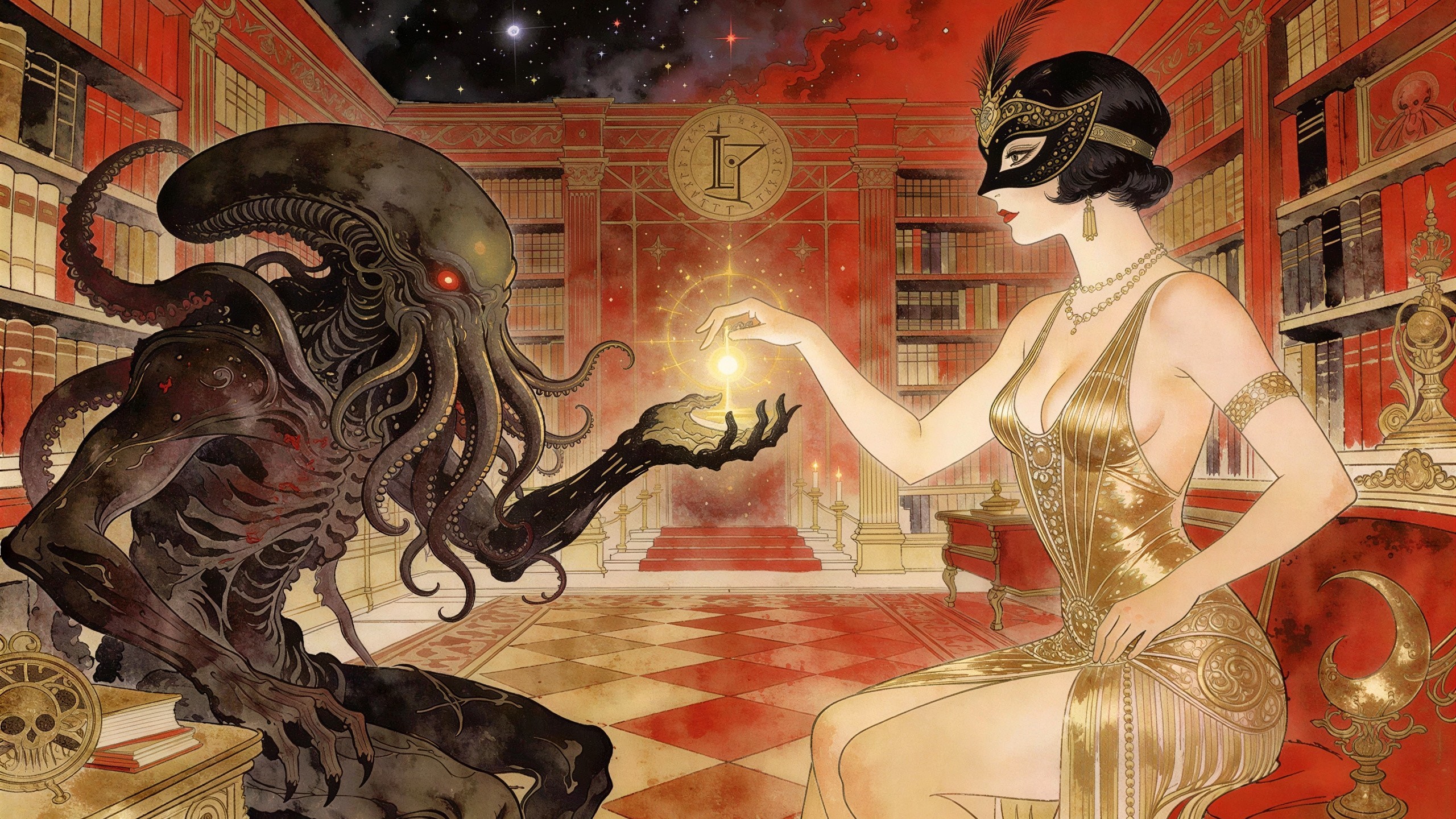 Prompt: 1930s. Art Deco, Lovecraftian Nyarlathotep, magical ritual, in the library. Decadent, masked flapper girl and necromancy.