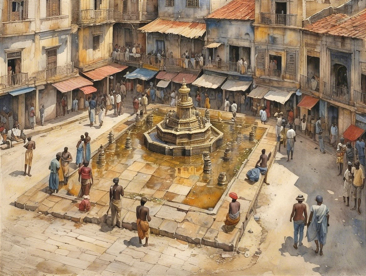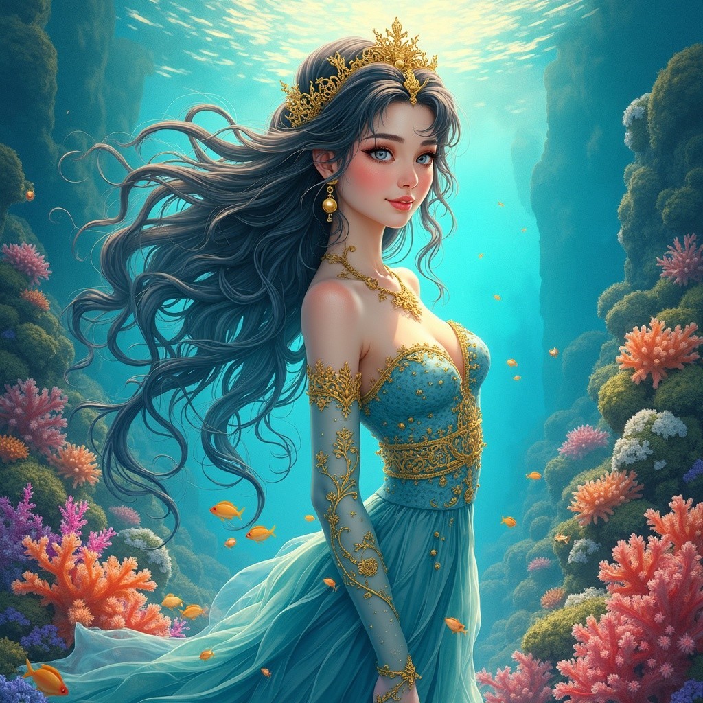 Prompt: Golden ratio, ultra detailed watercolor painting, wet on wet painting, soft edges beautiful (((Masterpiece))) Create an image of a calico cat partially submerged in water, with its face and upper neck visible just above the surface. The cat has distinct patches of orange, black, and white fur, giving it a vibrant and colorful appearance. Its eyes are large and expressive, with a bright green hue that reflects the light filtering through the water. The background is a rich underwater scene, with lush aquatic plants and rocks in various shades that add texture and depth. To the right of the cat, a small goldfish swims gracefully, enhancing the aquatic theme. The surface of the water is slightly rippled, reflecting the green hues of the underwater vegetation. The overall composition should convey a sense of curiosity and wonder, capturing the serene beauty of this underwater Encounter. No frame no artifacts no words.