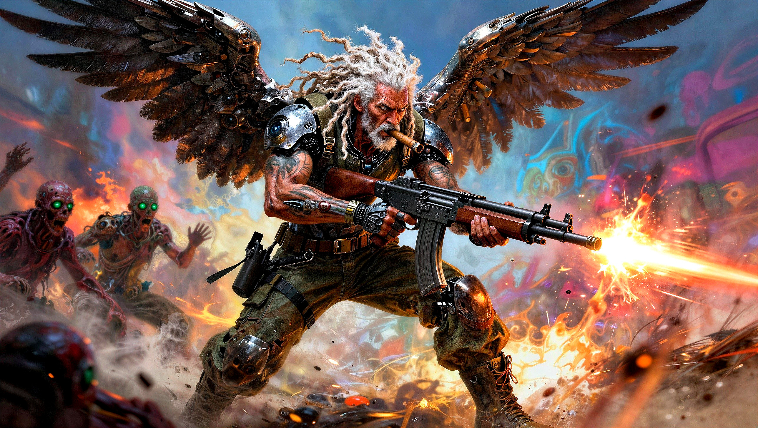 Prompt: Depict an epic celestial battle between ancient gods in a mythological realm. The scene features towering divine beings clashing in mid-air above a shattered mountain range, with lightning bolts, firestorms, and magical energy swirling around them. One god wields a flaming sword, another commands a storm with a trident, while others summon elemental forces like ice, wind, and earth. Their armor glows with sacred runes, and their eyes burn with cosmic power. The sky is torn between day and night, with galaxies and thunderclouds colliding overhead. Below, mortals watch in awe from ruined temples and crumbling cliffs. Style inspired by fantasy realism, cinematic lighting, and mythological grandeur. Use dramatic contrast, glowing effects, and dynamic motion to emphasize the chaos and majesty of divine warfare.