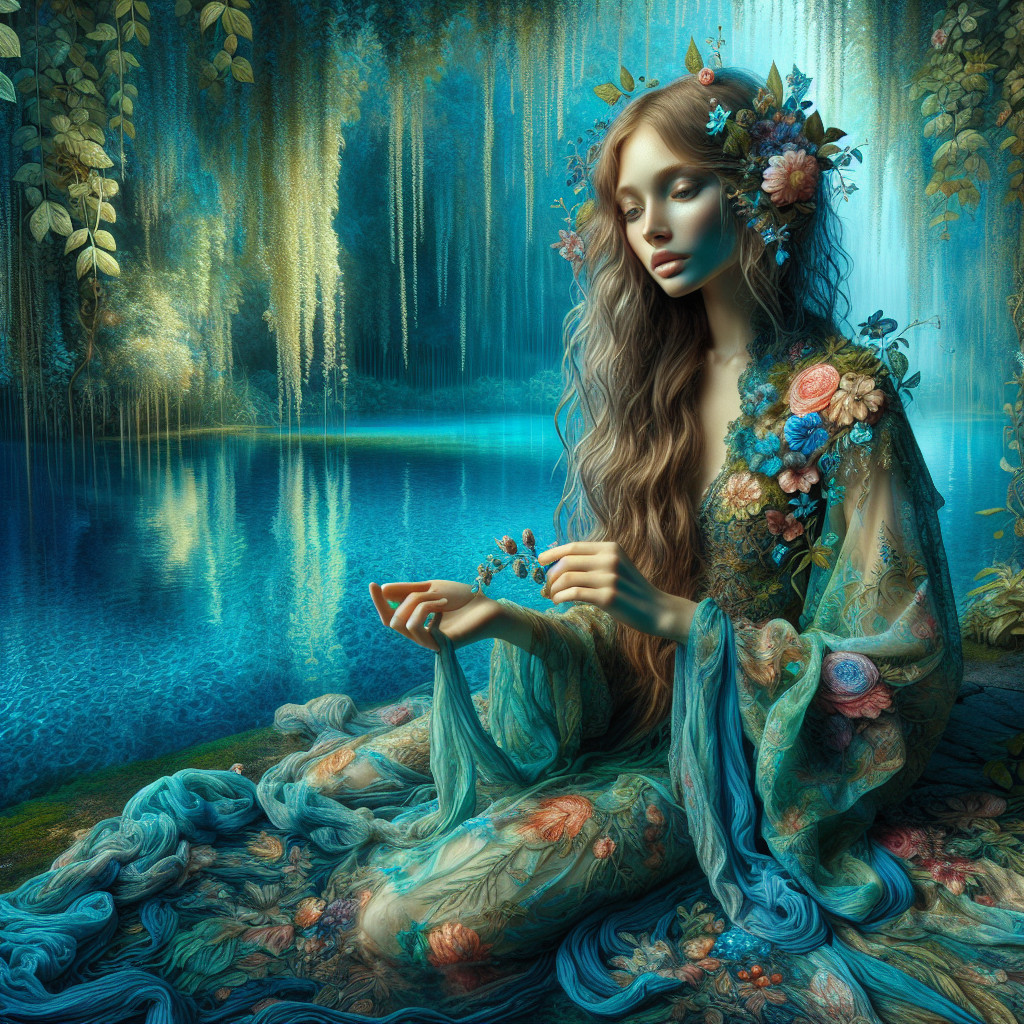 Prompt: A living water spring woven with shimmering turquoise streams and delicate blue silk threads, where a young nymph bathes. Her expression is enigmatic and captivating, with long, wavy, light hair. She wears a wet exotic floral dress, adorned with glowing tropical flowers. Around her, a luminescent blue lake shines, surrounded by green emerald vines.
