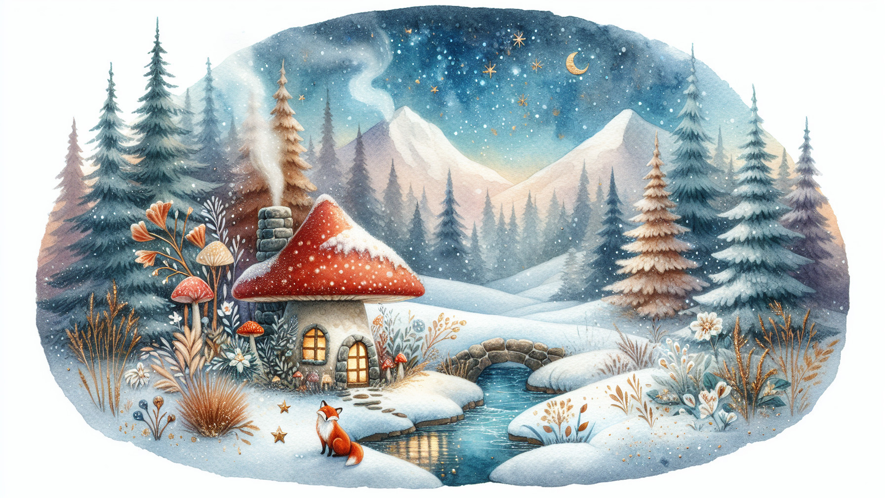 A tranquil winter scene featuring a cozy, rustic cabin with a thatched roof nestled beside a calm, reflective lake. The landscape is surrounded by tall, snow-covered pine trees under a dramatic sky illuminated by a large, glowing full moon. Wisps of clouds drift across the moonlight, creating a magical atmosphere. Snowflakes gently blanket the ground, and the water's surface has ripples reflecting the moonlight. The setting evokes a sense of peace and isolation in a pristine, wintry forest.