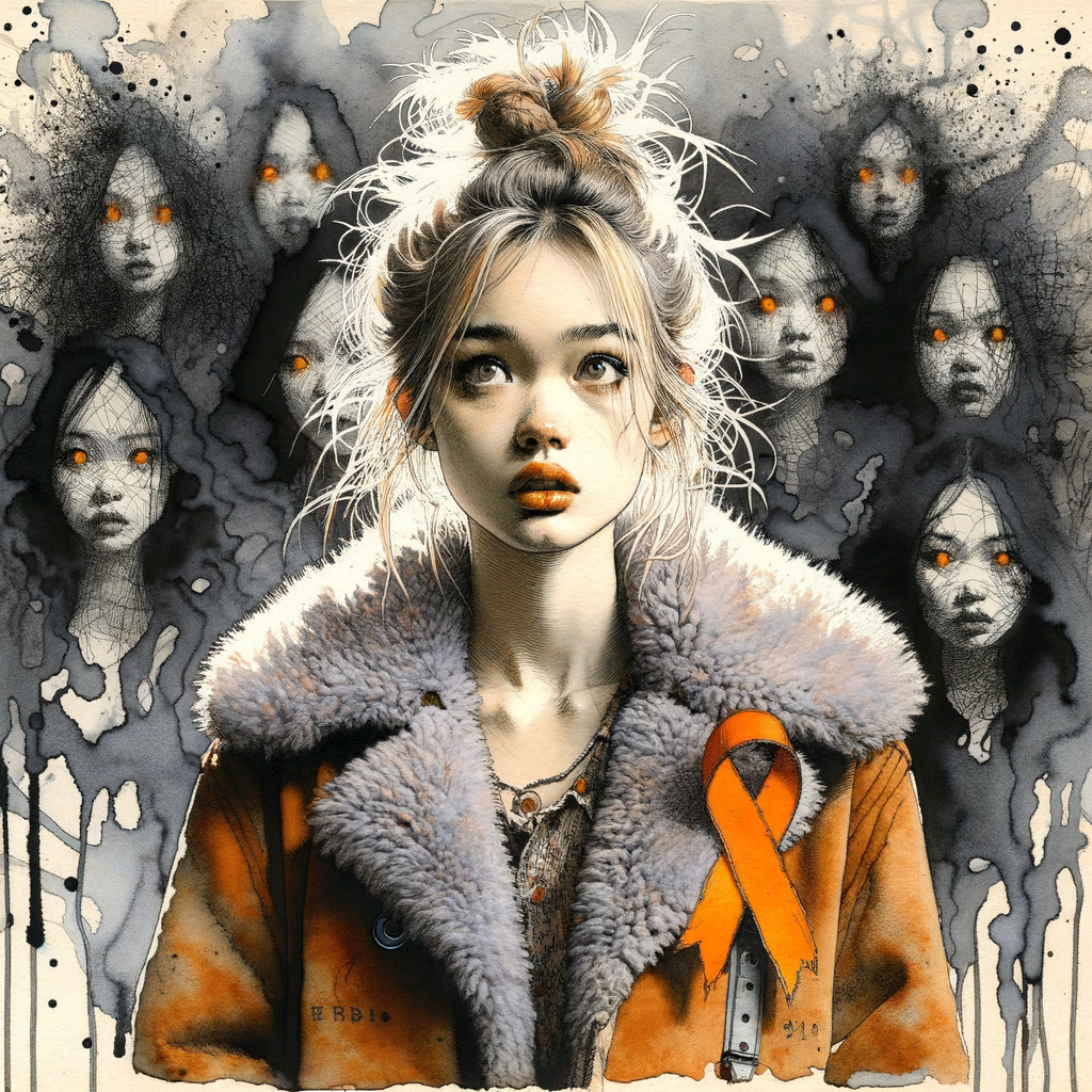 Prompt: Create an artistic depiction of a female figure drawn with a dynamic and vibrant swirly scribble style in a rough black ink and coloured pencil sketch. The subject has a fair skin tone and features a confident pose, one arm extending outward. She wears a jacket over a shirt, with the jacket’s collar slightly raised. Her pants create a striking contrast with the upper attire. The figure is complemented by a classic fedora, adorned with a band. The colours of the clothing and hat are in modern high fashion shades.