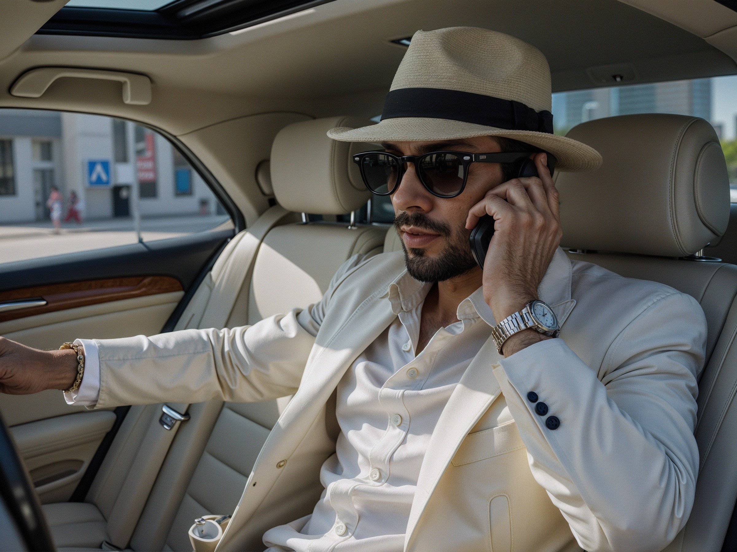 Prompt: Use 100 % das características da imagem enviada para criar uma imagem de Um homem elegante sentado no banco traseiro de um carro de luxo. Ele veste um terno de "Smooth Criminal": O elegante fato branco risca de giz e o fedora a condizer,, está falando ao celular com expressão séria e confiante. O interior do carro é sofisticado, com bancos de couro branco e detalhes em madeira nobre. O homem usa um relógio rolex e está posicionado de forma composta e profissional. A janela do carro revela uma paisagem urbana com prédios clássicos ao fundo, sugerindo uma cidade europeia. A iluminação é suave e natural, destacando o ambiente de riqueza, sucesso e estilo executivo.