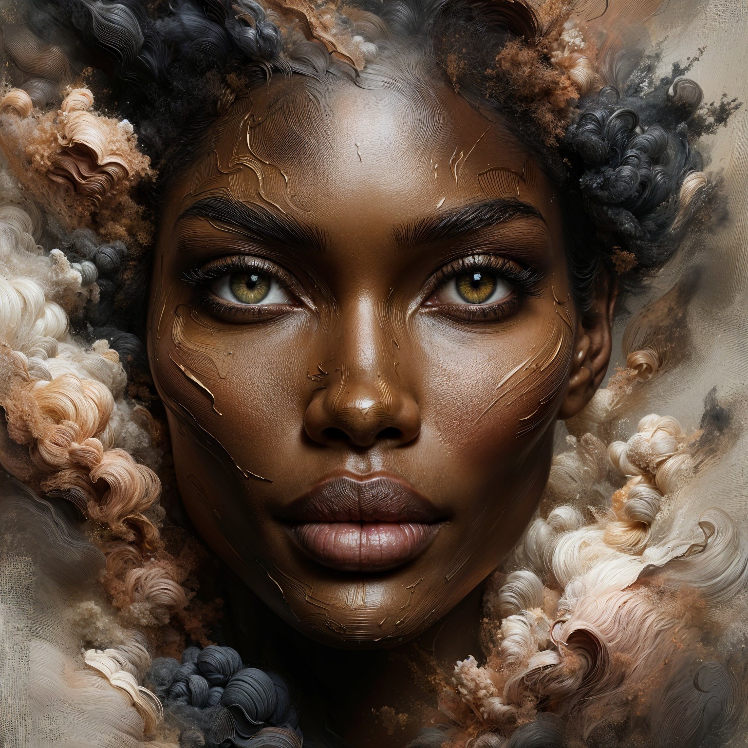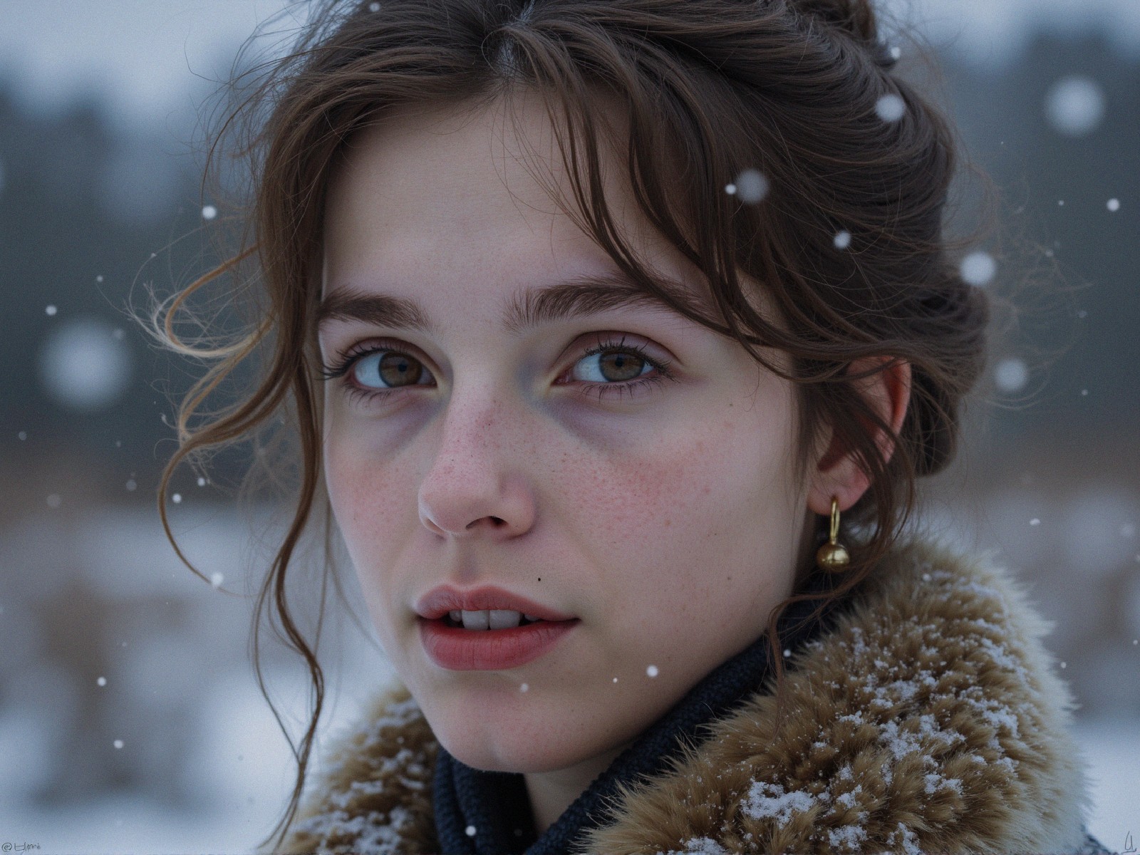 Prompt: detailed wintry landscape painting by John William Waterhouse, Audrey Hepburn, 24 standing in snow-covered forest clearing, snow flakes falling everywhere. beautiful tall young fashion model, hands clasped in front, head tilted backward, soulful expression facing the viewer directly, beautiful face, floor length hooded haute couture long metallic gold embroidered damask gown, hem trimmed with dark brown fur, long fur trimmed sleeves, capes hood lined with dark fur,