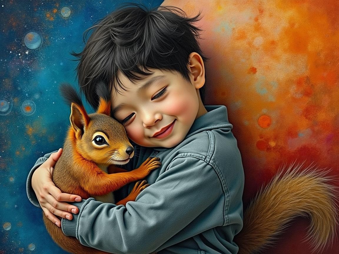 Prompt: Surrealism, cubism, Zdzisław Beksiński, Joan Miró, Leonora Carrington, Igor Morski, Sonia Delaunay, Salvador Daly. Fantasy, fantastic view, close up, dreamy. Fantasy, fantastic view, close up, dreamy. A child's drawing of a dark-haired boy happily hugging a fluffy baby squirrel against the background of space. The picture is to be done strictly in the style of oil on canvas.(((Dear DDG, please exclude black and exclude grey as a mixture of white and black)))