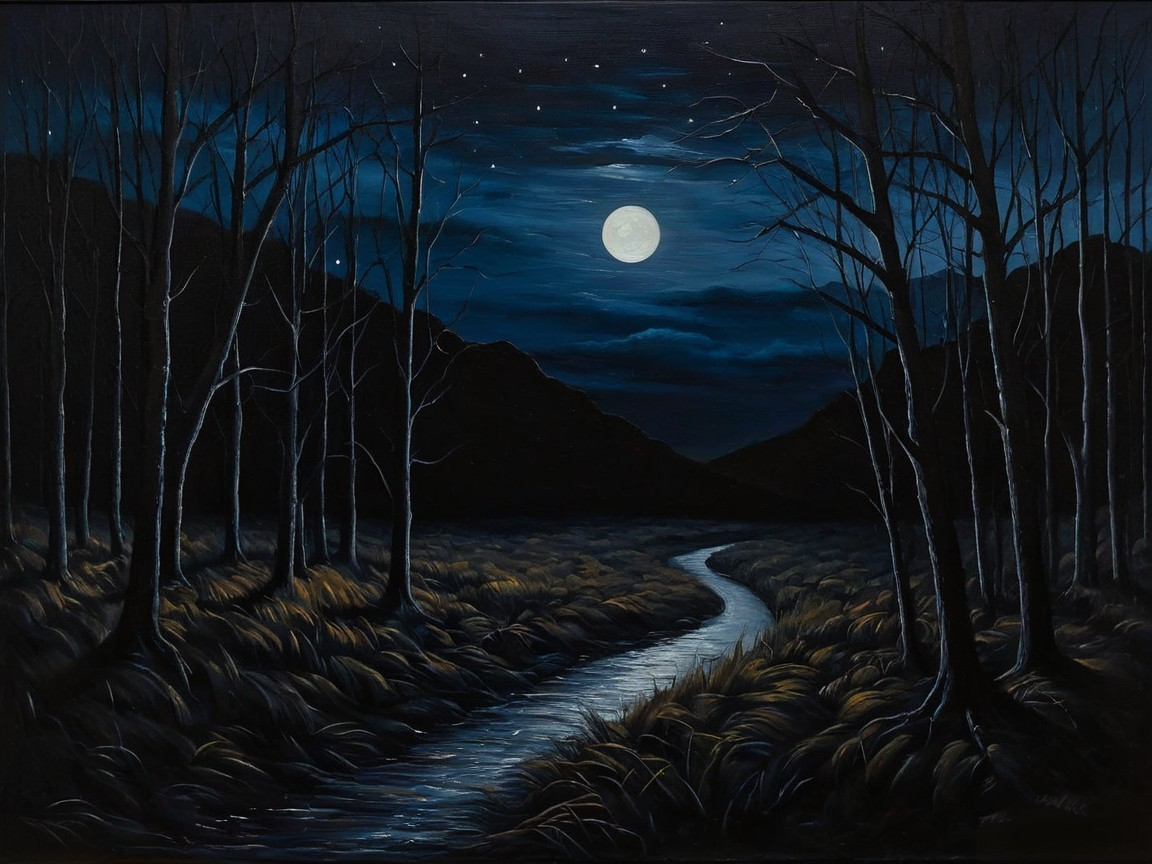 Prompt: Create a serene landscape scene featuring a wooden dock extending into a calm, reflective body of water. The dock should be positioned slightly off-center, leading the viewer's eye toward the still water. Surrounding the dock, tall grasses and marsh plants are prominent, swaying gently in the breeze. In the background, trees adorned with Spanish moss frame the scene, providing a rich, natural contrast to the brightness of the sky.