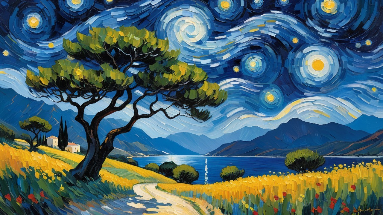 Prompt: A starry night over the mountains of Salalah’s Siniya region, with swirling cobalt skies and vibrant cypress-like trees silhouetted against luminous stars, the calm Arabian Sea reflecting the celestial glow—painted in the bold, expressive brushstrokes and vivid palette of Vincent van Gogh.