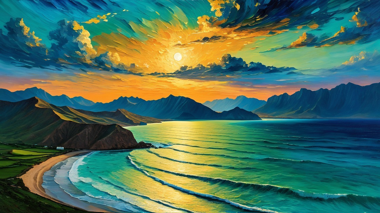 Prompt: Klimt,Kandnsky, Miro, Hundertwasser, Mixed Style: Create a vibrant winter landscape painting with a peaceful scene: A tranquil lake reflects the bright sky. The background displays a gentle gradient of colors at dusk, transitioning from a delicate orange to a deep blue, adorned with twinkling stars and a bright crescent moon. Tall, dark green pines and scattered, leafless trees frame the composition around the lake, adding structure. To the right, a cozy wooden cabin with a snow-covered roof radiates warm light from its windows, inviting you to linger amidst the cold. In the foreground, delicate white winter flowers with green stems bloom on the snow-covered shore, bringing life and color to the scene. The ground is mostly covered with glistening white snow, its fine texture hinting at the snow's softness and, in places, translucent grass beneath. Make sure that the reflections in the lake reflect the bright colors of the sunset and the shapes of the surrounding trees and the cabin, thus creating a harmonious and peaceful winter evening atmosphere.