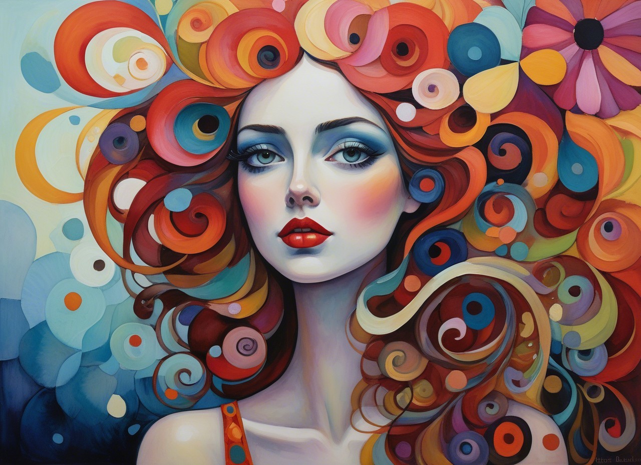 Prompt: A surreal, dreamlike artwork in style of Scott Bergey, Richard Burlet and Igor Morski: Whimsical Women in Colorful Garden, festive clothing, stylish hairdo. By Susanne.