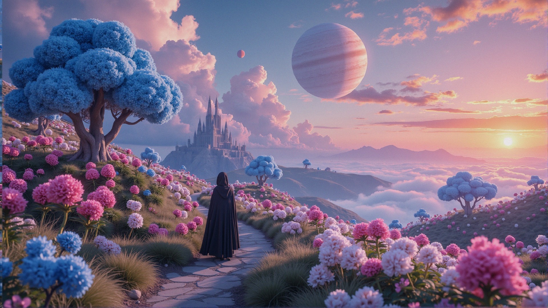 Prompt: A luminous, visionary portrait of a woman whose presence feels woven from color and imagination. Her face is serene and radiant, framed by cascading hair in vivid rainbow hues that unfurl into the sky like wings or living light. Around her, floating balloons, planets, and glowing orbs drift through a star-filled night, blending fantasy and cosmos. Behind her rises a dreamlike city of towers and spires, softened by clouds and saturated color, as if born from thought and wonder. Her ornate dress blooms with flowers and layered textures, echoing the richness of the world she inhabits. The atmosphere is joyful, transcendent, and surreal — a celebration of creativity, inner worlds, and boundless imagination. Ultra-saturated color, intricate detail, painterly fantasy illustration, dream logic, magical realism, luminous glow, whimsical yet powerful.