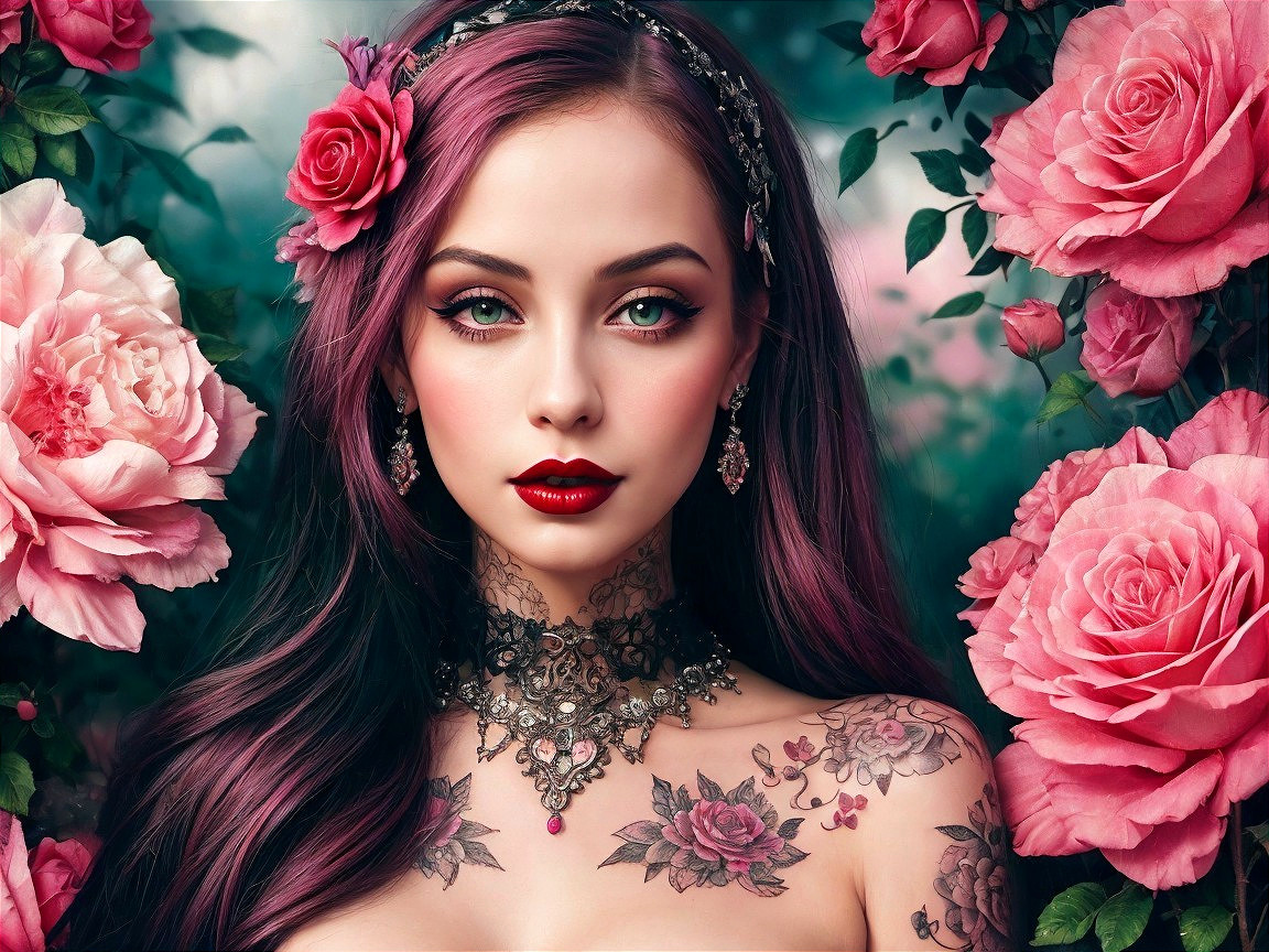 Prompt: a sultry TicTok fashion influencer long blonde hair brown eyes red lips wearing a black lace top red latex jeans black ankle boots multiple rings, bracelets, earrings and a necklace posing in her room