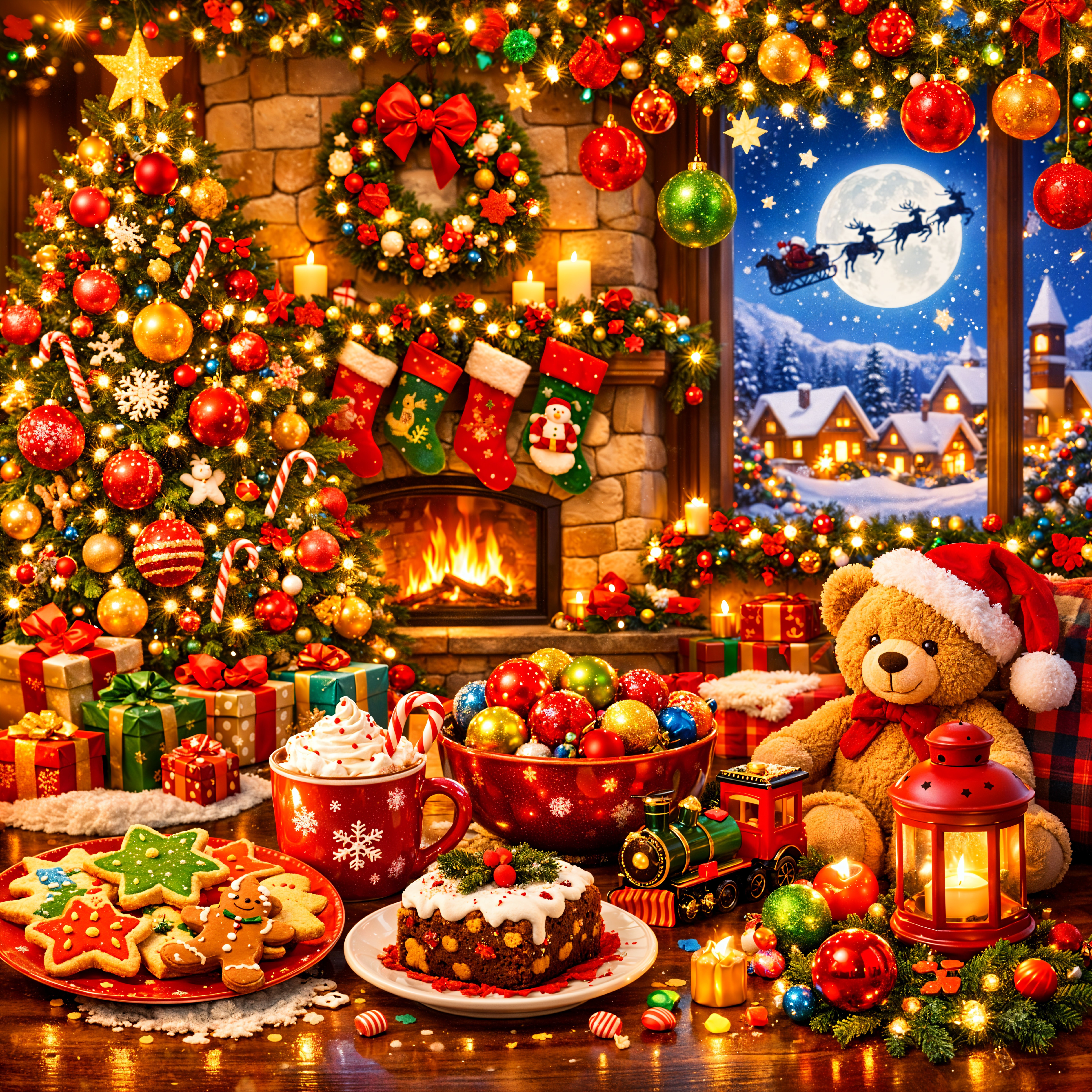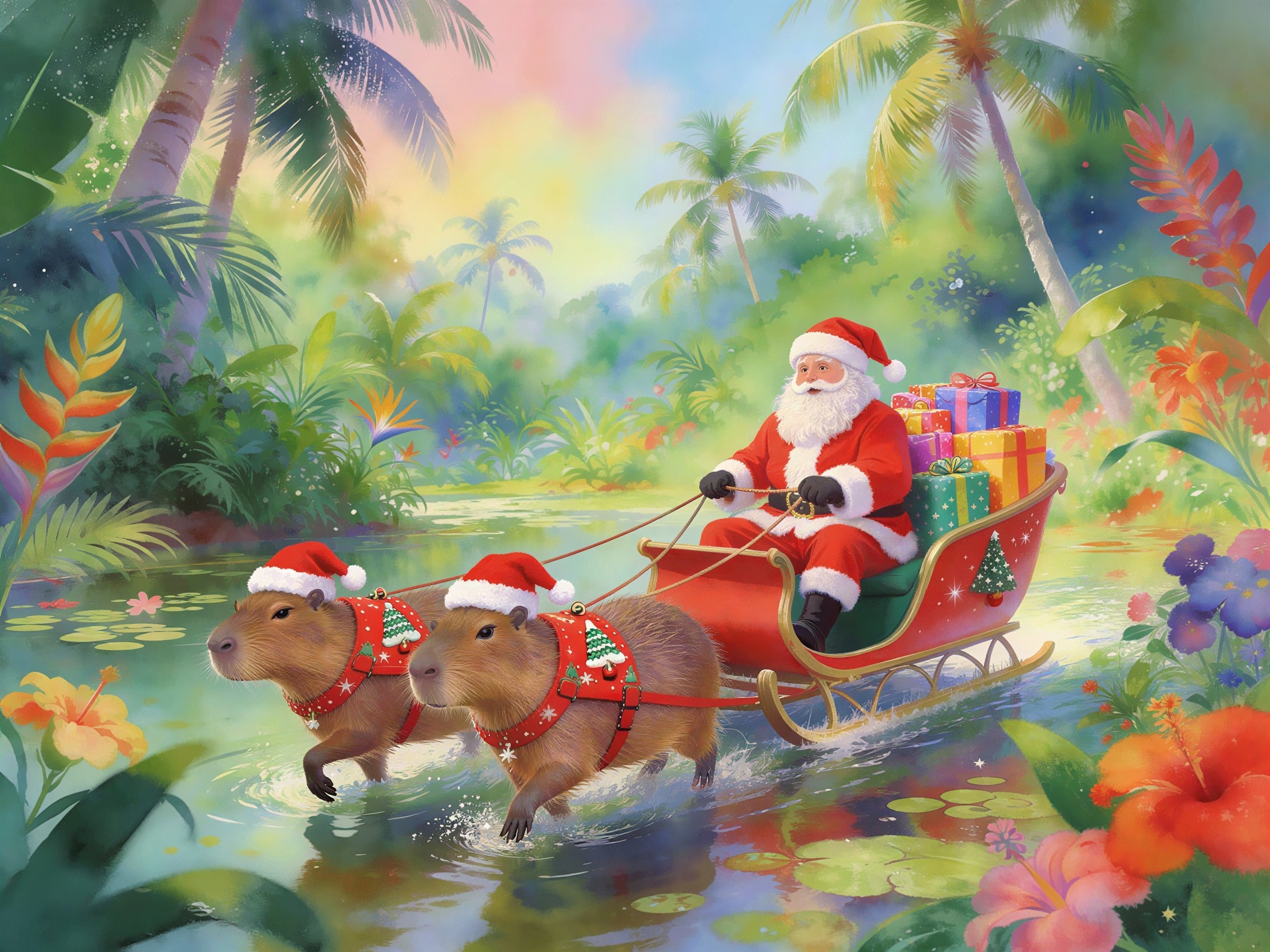 Prompt: An enchanting airbrush of Santa Claus riding in a sleigh loaded with brightly wrapped presents. The sleigh is being pulled through a tropical wetland by two capybaras wearing Christmas-themed harnesses and Santa hats. The background is filled with lush green vegetation and a vibrant, natural environment. The atmosphere is cheerful and whimsical, blending Christmas holiday elements with an exotic tropical setting.