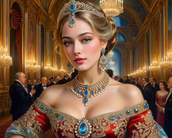 Prompt: Create a highly detailed and atmospheric digital painting that merges the dramatic ancient ruins landscape with a stunning portrait of a young woman. The background features majestic, weathered Roman-style stone ruins with arches and columns, partially submerged in a misty, turbulent river under a stormy sky illuminated by striking lightning and soft sun rays piercing through heavy clouds. In the foreground, place a graceful young woman with flowing, wavy auburn hair accented with decorative teal and orange leaves, her porcelain skin glowing softly with natural blush tones. She wears an elegant, intricately patterned teal dress that harmonizes with the color palette of the ruins and sky. Behind her, incorporate a circular, art nouveau-inspired halo of soft blues, golds, and creams with delicate ornamental details, blending seamlessly with the stormy ruins environment. The overall mood is a captivating blend of classical antiquity, mysticism, and serene beauty, rendered in a photorealistic yet painterly style with rich textures, dramatic lighting, and harmonious color contrasts.