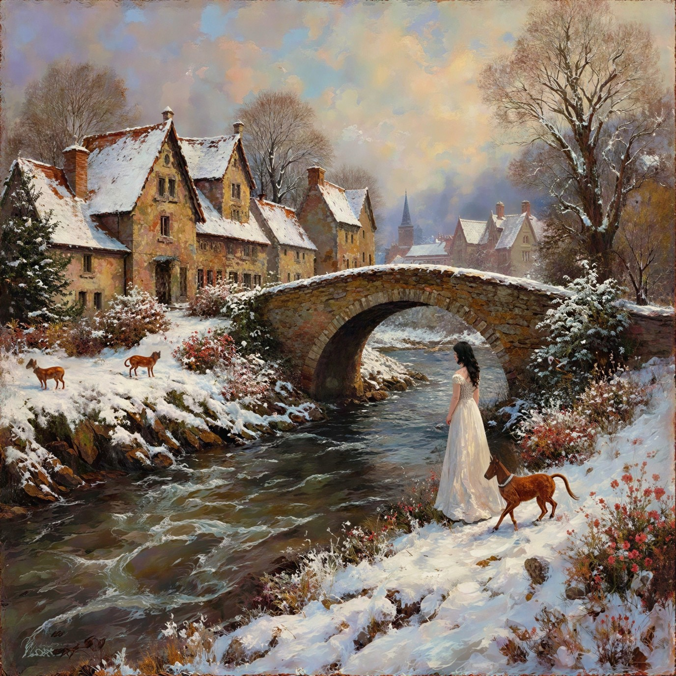 Prompt: An abstract painterly texture with thick impasto oil paint and heavy palette-knife strokes, creating visible ridges, cracks, and sculpted depth on a glossy, reflective surface. Smears of color create a rough, tactile texture against a smooth neutral background. This texture overlays a beautiful, cozy winter wonderland landscape featuring mountains, a village, and snowy trees, bathed in soft sunset light. The scene is imbued with atmospheric, magical mood and perfection, rendered in breathtaking, 8k resolution, with sharp focus and best quality.