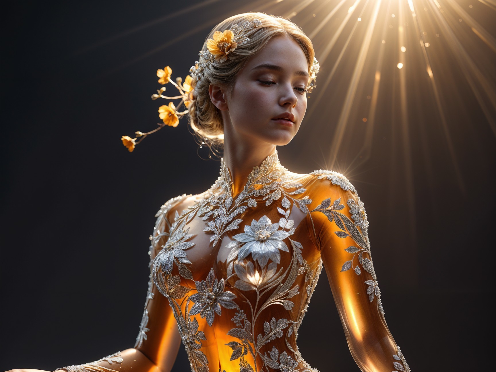 Prompt: A female figure completely made of transparent crystal, her body filled with delicate floral patterns that seem to bloom within the glowing substance. Light shines through her from behind, casting a soft, radiant glow that highlights the intricate details of the flowers within her form. Her figure is ethereal and graceful, the amber shimmering with silver hues as the light passes through her translucent skin. The surrounding atmosphere feels mystical, as if she exists in a dreamlike world, blending nature, light, and elegance in a harmonious dance.